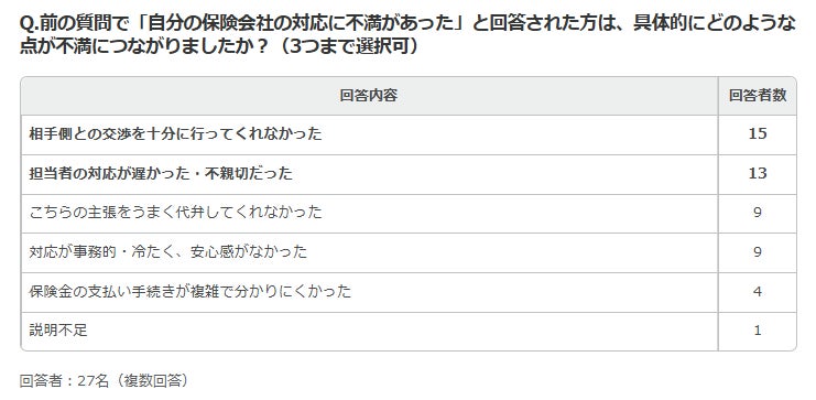 保険会社への不満に対するより細かい調査では「相手方との交渉が不十分だった」「対応が遅かった」といった声が目立ちました。こうした交渉力や対応力は、契約時点で判断するのが難しいのが実情です。いざというときに備え、納得がいかない場合は担当者の変更を依頼する、弁護士費用特約を活用するなど、自分の立場を守る手段も把握しておくことが重要です。