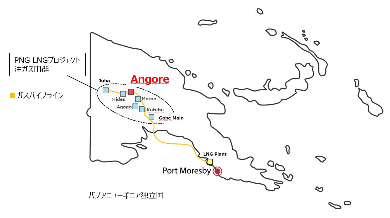 PNG LNGプロジェクトは、パプアニューギニア内陸部のガス田等から生産される天然ガスを総延長約700kmのパイプラインで輸送し、同国首都ポートモレスビー近郊の液化プラントでLNG(液化天然ガス)を生産して輸出するプロジェクトであり、当社は、事業化検討段階から参画してまいりました。今般生産を開始したアンゴレガス田は、生産中のハイズガス田の近くに位置しており、PNG LNGプロジェクトの一環として新たに開発されたものです。同ガス田は、1兆立方フィート (TCF注) の埋蔵量を有しており、最大日量350百万立方フィート(MCF/d)を生産することにより、PNG LNGプロジェクトの生産レベル維持に貢献いたします。