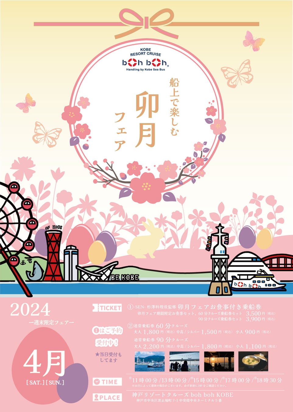 桜満開の春真っ盛り、4月の週末限定で神戸シーバスboh boh KOBEでしか味わえない「神戸食」をお愉しみいただける「卯月フェア boh boh KOBE号」を期間限定で開催!