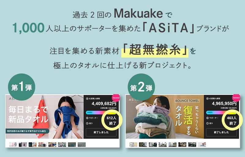 過去2回のMakuakeで1000人以上のサポーターを集めた「ASiTA」ブランドが、注目を集める新素材「超無撚糸」を極上のタオルに仕上げる新プロジェクト。