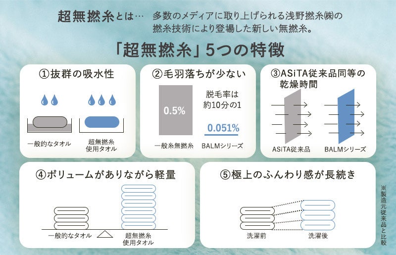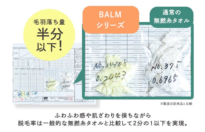 新素材“超無撚糸”を使った「超」ふわふわなのに毛羽落ちが少ない新作タオル「BALM」