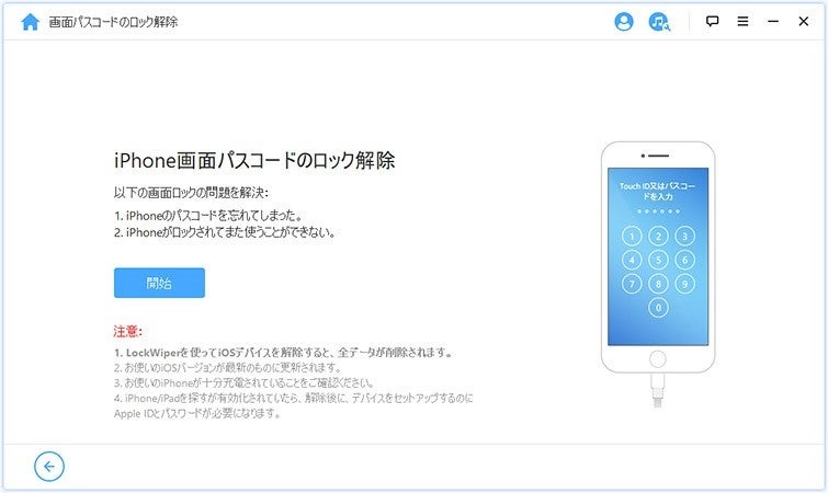 iOSデバイスの画面ロック(4 / 6桁パスコード、Touch ID、Face ID、英数字パスワード)を忘れた場合、ワンクリックでロック解除できます。