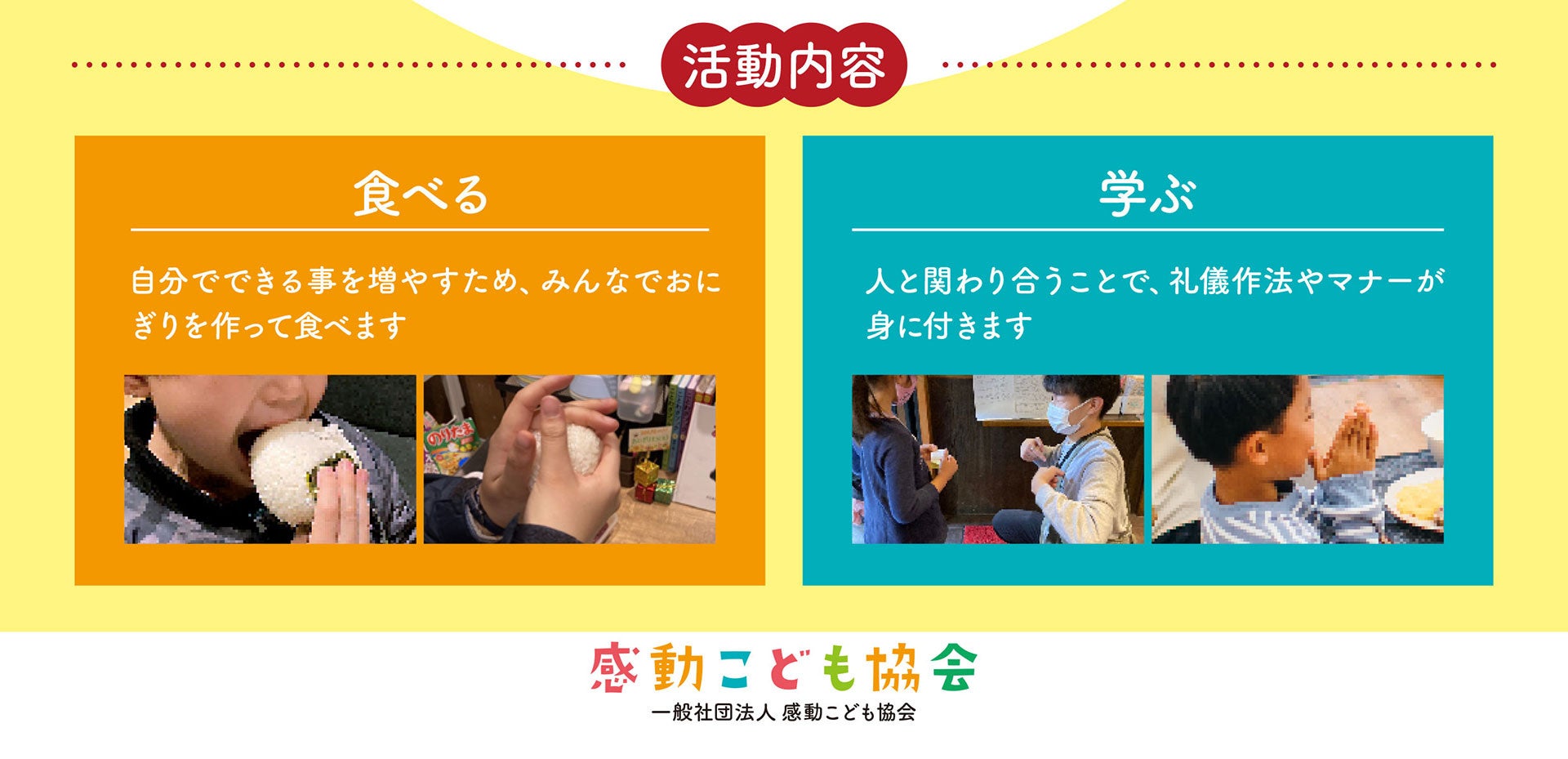 感動こども協会は、「感動こども食堂」「スマイルこども食堂」の開設支援と運営サポートを行う団体です