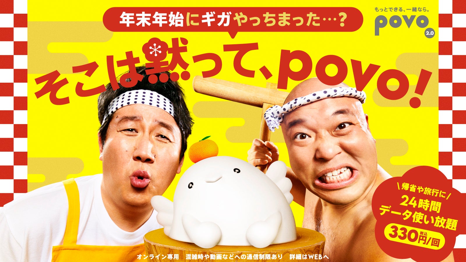 あわせて、2024年1月19日までのpovo2.0新規加入で、3日間データが使い放題になるキャンペーンを実施します。さらに3日間使い放題にかけて、2023年12月26日13時30分頃から72時間にわたり、お笑いコンビ「クールポコ。」さんが「AIクールポコ。」となって餅つきをする様子をpovo公式TikTokで配信する「男は黙って、72時間餅つき」を実施します。