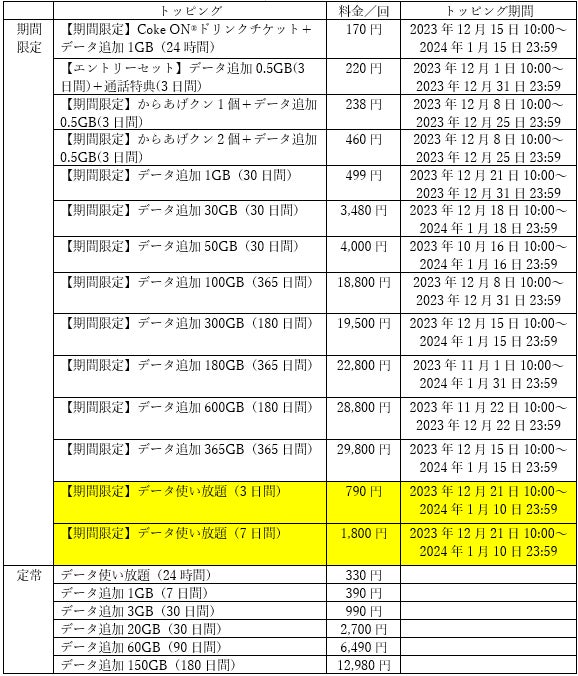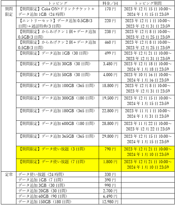 【期間限定】データ使い放題(3日間) | 790円 | 2023年12月21日10:00~ 2024年1月10日23:59 |