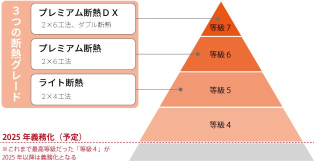今回、「プレミアム断熱DX」の誕生とともに、3つの断熱グレードを新設。ウィザースホームの標準仕様「プレミアム断熱」は、断熱仕様をさらに充実させて、UA値0.39W/㎡・Kで断熱等級6に対応。上位グレードの「プレミアム断熱DX」は、UA値0.24W/㎡・Kで最高ランクの断熱等級7に対応します。また断熱等級5に対応する「ライト断熱」もラインナップ。3つのグレードからこだわりや予算に応じて断熱性能を選ぶ新しい住まいづくりができます。さらに、どのグレードを選んでも2025年に義務化予定の断熱等級4を大きく上回り、将来にわたって快適な暮らしを実現することができます。