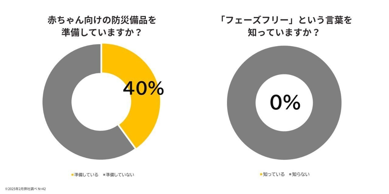 イベント参加者への調査によると、赤ちゃん向けの防災備品を準備している家庭は約4割にとどまりました。地震大国である日本に住みながらも、大人とは異なる必要品が多い赤ちゃんに対してでさえ、もしもの備えをしていない家庭が多いことが浮き彫りになりました。