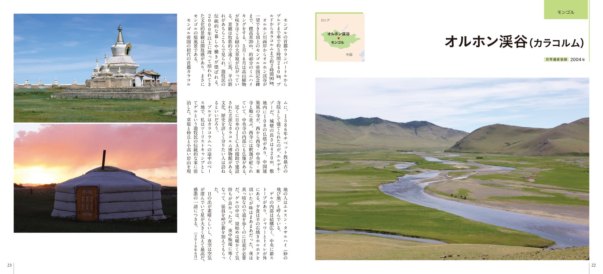 各地の紹介はすべて見開きで完結。メイン写真とサブの間に、富山愛子による撮影地の紹介や旅のエピソードを掲載。実際に旅した者ならではの臨場感溢れるエピソードが綴られ、家に居ながらにして地球中を旅することができます。