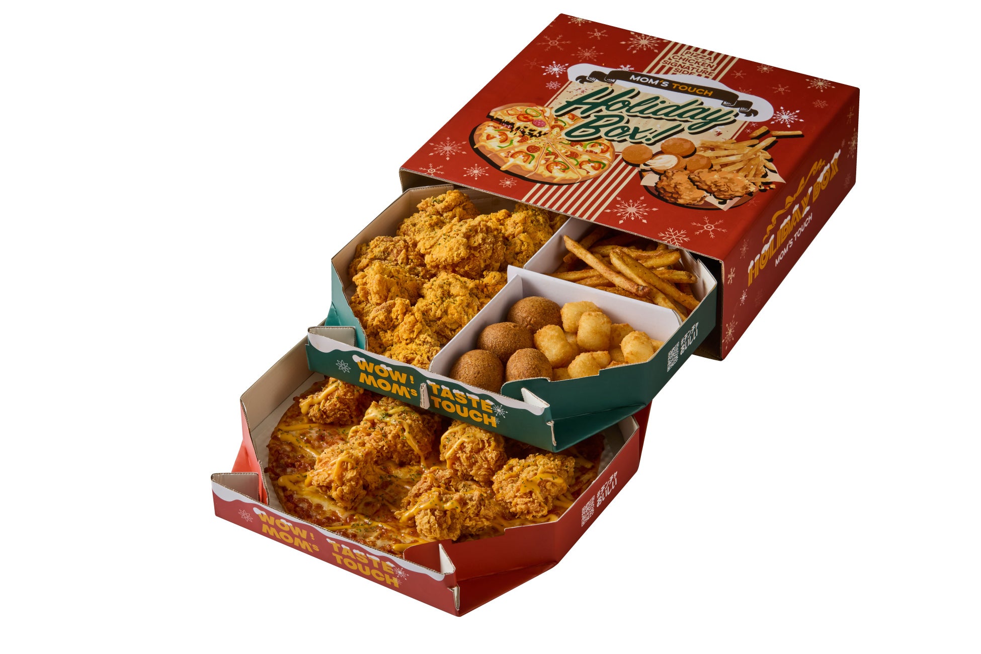 ホリデーシーズンに合わせて発売する「ホリデーボックス」は、日本マムズタッチでは初となる「サイピザ」、「おモチボール」が入っています。さらに、マムズタッチの人気サイドメニュー「チーズボール」や「ケイジャンポテト」、「スノーチキン」も入っておりマムズタッチで人気のメニューをすべて詰め込みました。ホリデーボックスだけでも、パーティーを楽しむことができるほど、ボリュームたっぷりの年末ホリデーシーズン限定の商品です。また、ホリデー気分を感じていただきたいという思いから、赤と緑を使った限定デザインのパッケージにて販売します。家族や友人、恋人と過ごす時間が増える年末に、味もデザインも大満足のマムズタッチ「ホリデーボックス」 をぜひお楽しみください。