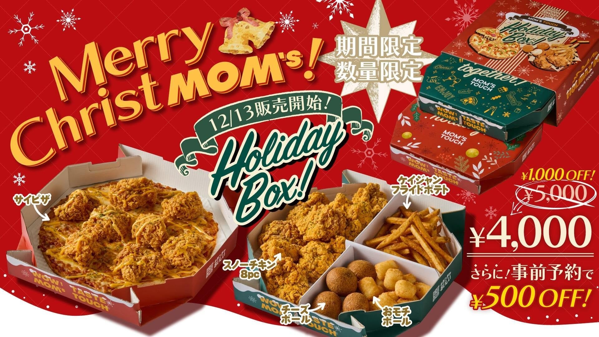MOM'S TOUCH TOKYO (本社:東京都渋谷区、以下:マムズタッチ)は、2024年12月13日(金)から2024年12月31日(火)までの期間、渋谷店にてホリデーシーズン限定メニュー「ホリデーボックス」を販売します。発売に先駆け、2024年12月1日(日)から、毎日先着100名限定で、事前予約を受付中です。また、事前予約された方は500円OFFでご購入いただけます。