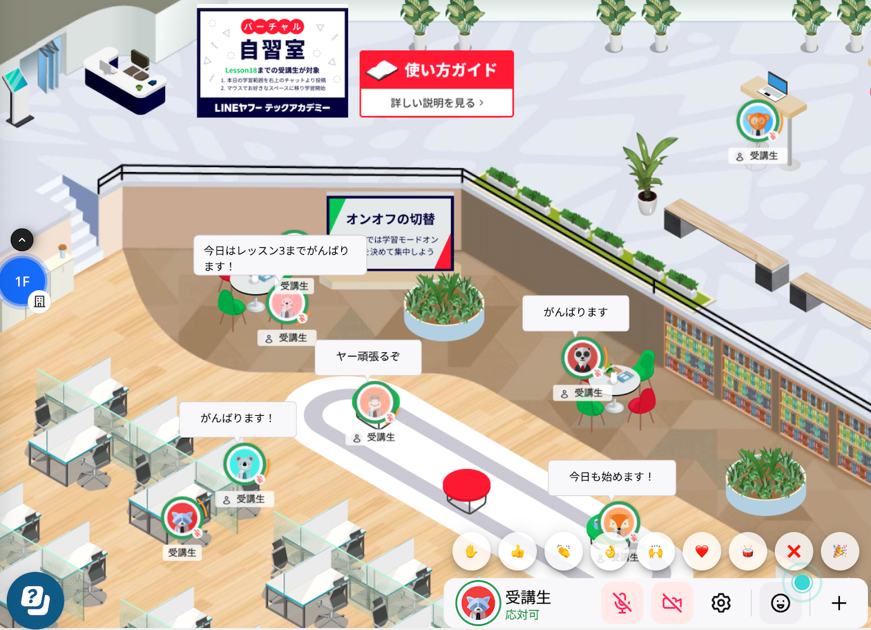 ユーザーは、メタバース上で自身のアバターを自由に動かして、「自習室」(図1)や「メンター相談室」(図2)などの各空間を移動でき、音声やチャットを通じた受講生同士のコミュニケーションや、キラメックスと契約しているメンターへの質問・相談が可能です。LINEヤフーで働く現役エンジニアによる講義などといったイベントへもメタバース上で参加(図3)できます。