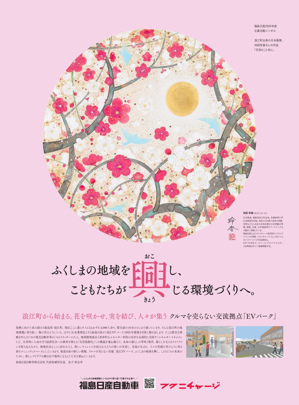福島日産では、2022年度以降の企業活動シンボルビジュアルに、企業理念の「いち、はやく」を象徴する花として春に先駆けて咲く「梅の花」をモチーフに取り入れております。また、例年 アーティスの方のお力を借りて、企業活動シンボルビジュアルを描き下ろししていただいております。