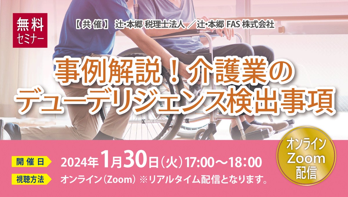 辻・本郷 税理士法人(本社:東京都新宿区、理事長:徳田孝司)は、辻・本郷 FAS株式会社(本社:東京都千代田区、代表取締役:山田翔吾)と共催で「事例解説! 介護業のデューデリジェンス検出事項」セミナーを開催いたします。本セミナーは、デューデリジェンス(以下「DD」)とバリュエーション(以下「VA」)の重要性から、辻・本郷 グループでの実際の事例をもとに、介護業でよくあるDDの検出事項を解説します。介護業でM&Aを通じてグループ拡大を検討している経営者の方向けに、注意点やポイントを説明いたします。