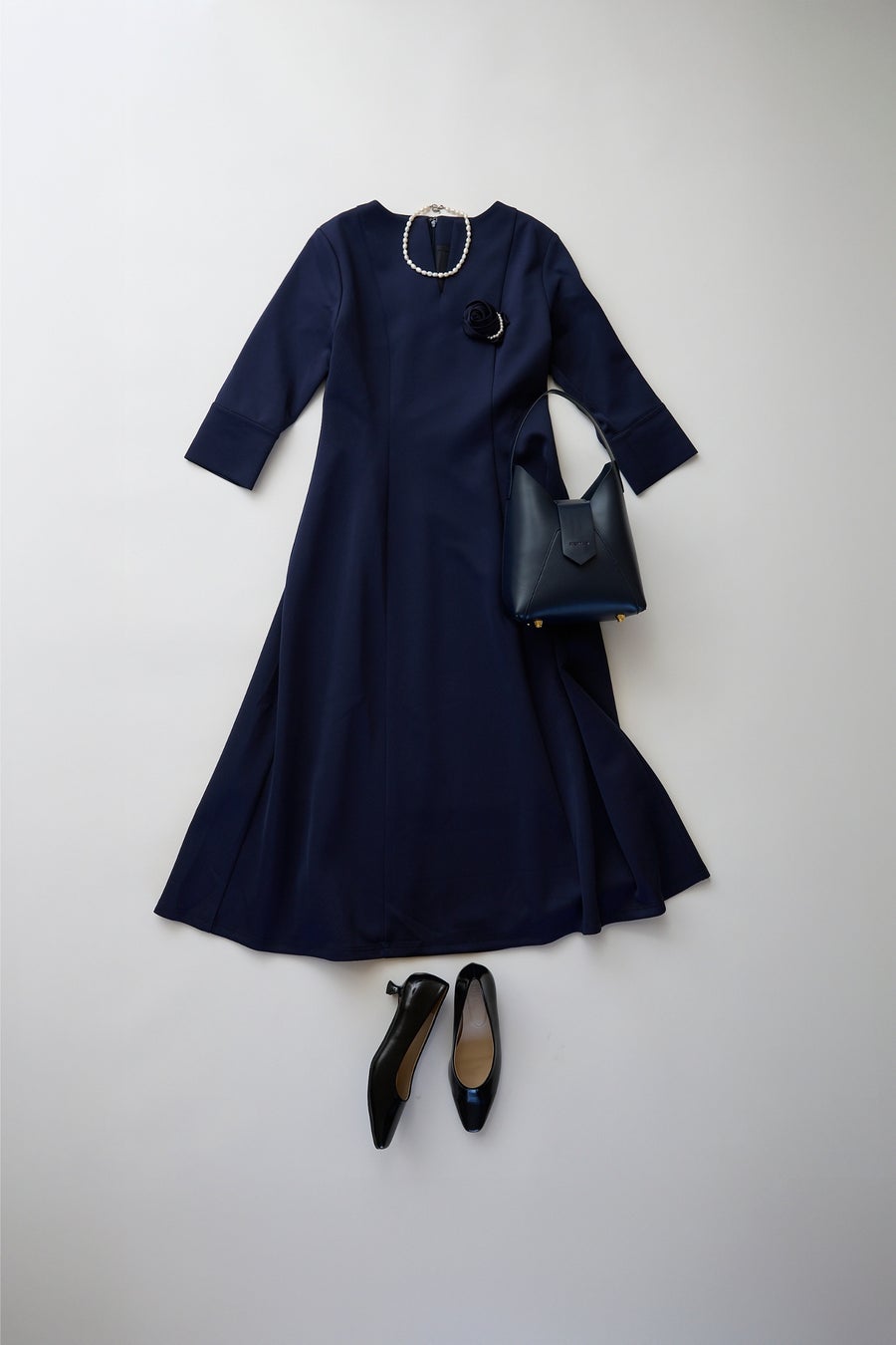 品のあるネイビーワンピースには、バッグやコサージュ、パンプスなど小物のカラーを統一して取り入れるとまとまりのあるスタイルに。