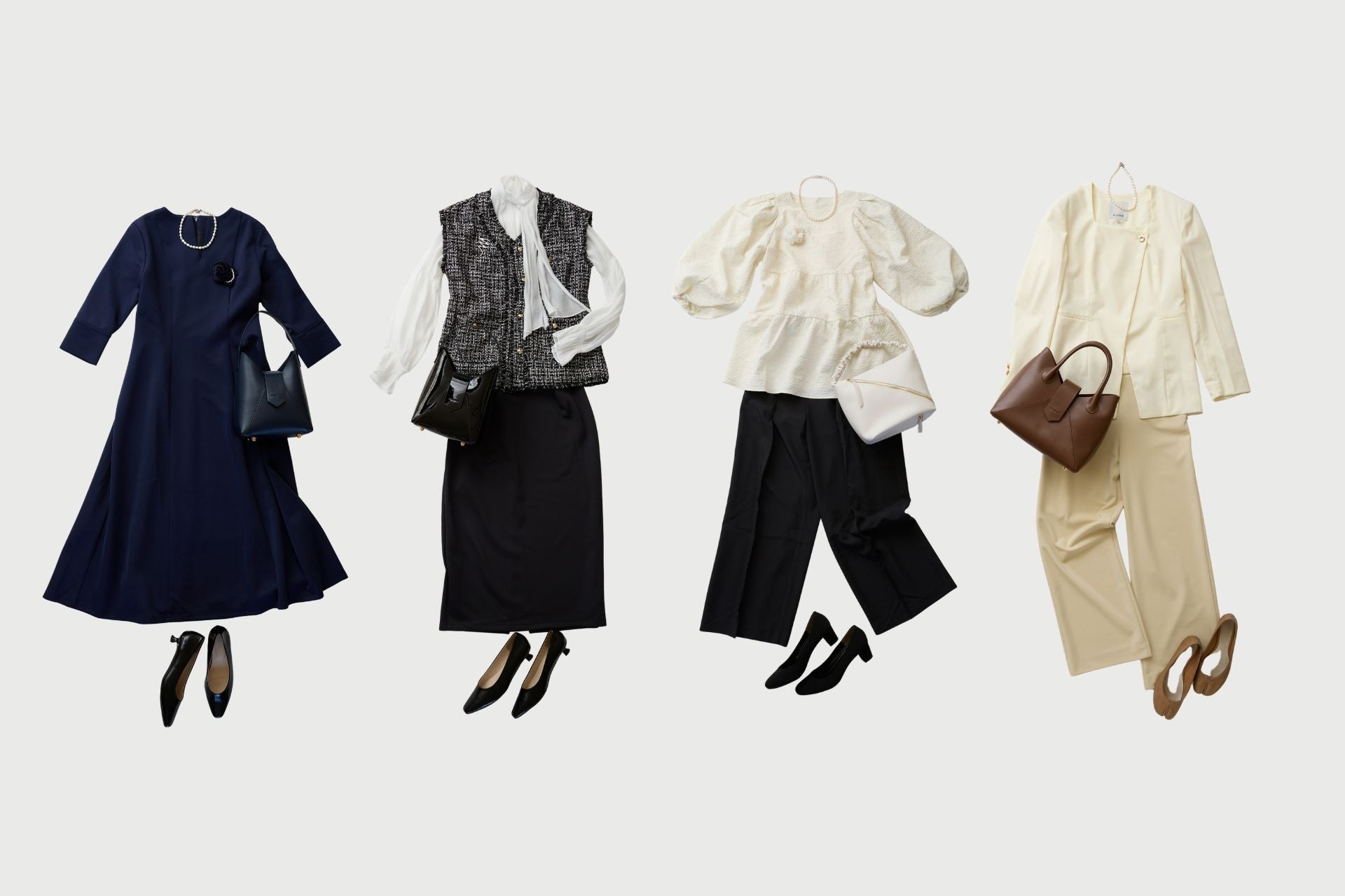 きちんと感が求められる特別な日から、仕事やプライベートまで。長く愛用できるおすすめバッグ4型を、セレモニーコーディネートとともにご紹介