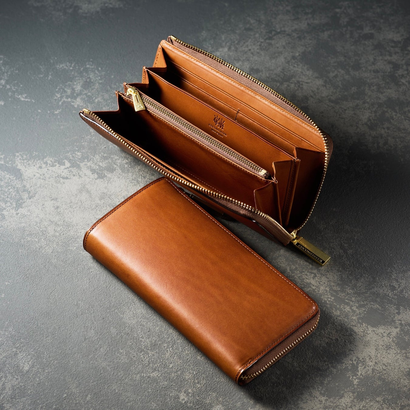 L字型のラウンドジップ長財布です。ファスナーがL字の為、開け閉めがしやすく使い勝手が良いです。またとても重厚感溢れるデザインに仕立てています。