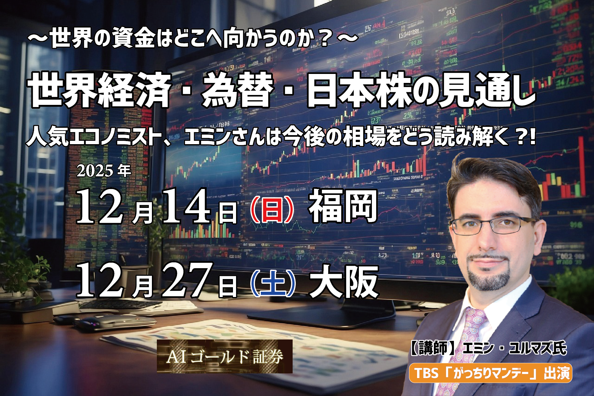 AIゴールド証券株式会社(本社:東京都中央区日本橋久松町12-8)と、カネツ商事株式会社(本社:東京都中央区日本橋久松町12-8)は共催で、人気エコノミストとして数多くのメディアに出演する エミン・ユルマズ氏 を招き、「世界経済・為替・日本株の見通し」をテーマとした、特別セミナーを 2025年12月14日(福岡)・12月27日(大阪) に開催いたします。世界情勢が大きく転換点を迎える中、国際金融市場の行方や日本株の展望について、第一線で活躍するエミン氏が最新の視点で読み解きます。