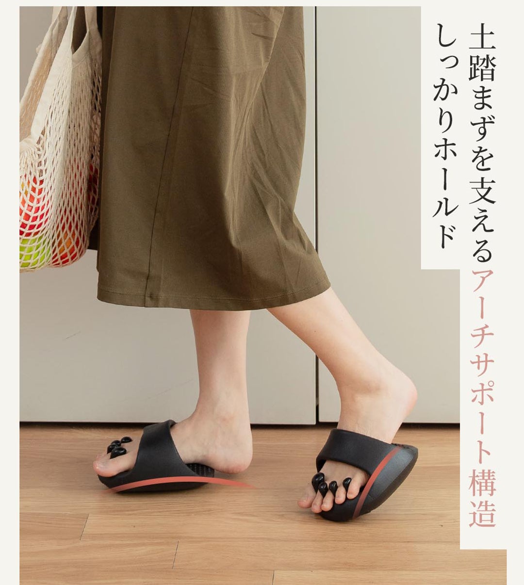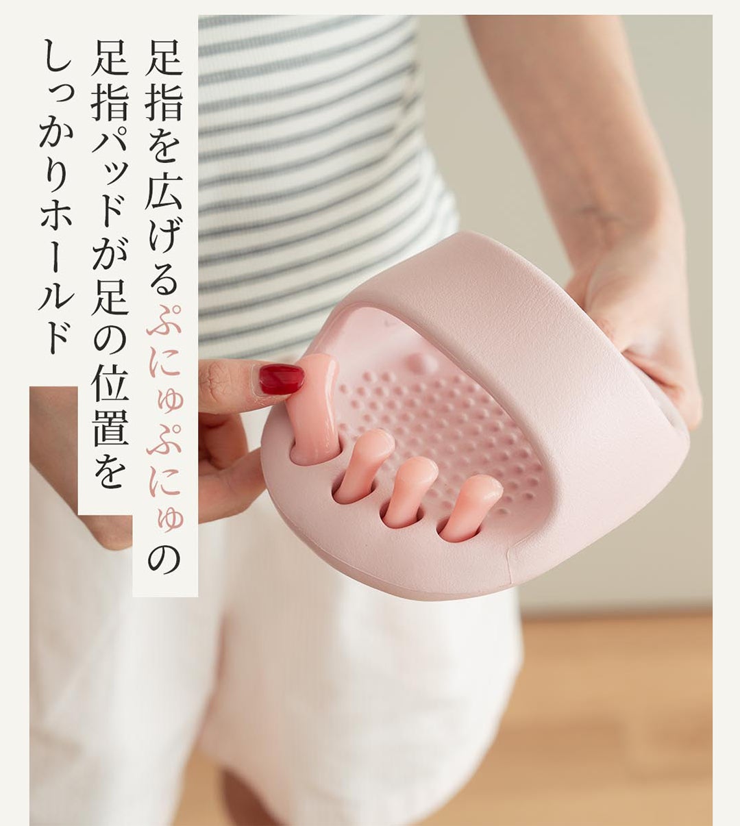 足指を広げて自然に姿勢をサポートしながら、足裏や土踏まずのツボを心地よく刺激することで、むくみケア・O脚対策・体幹意識まで促します。