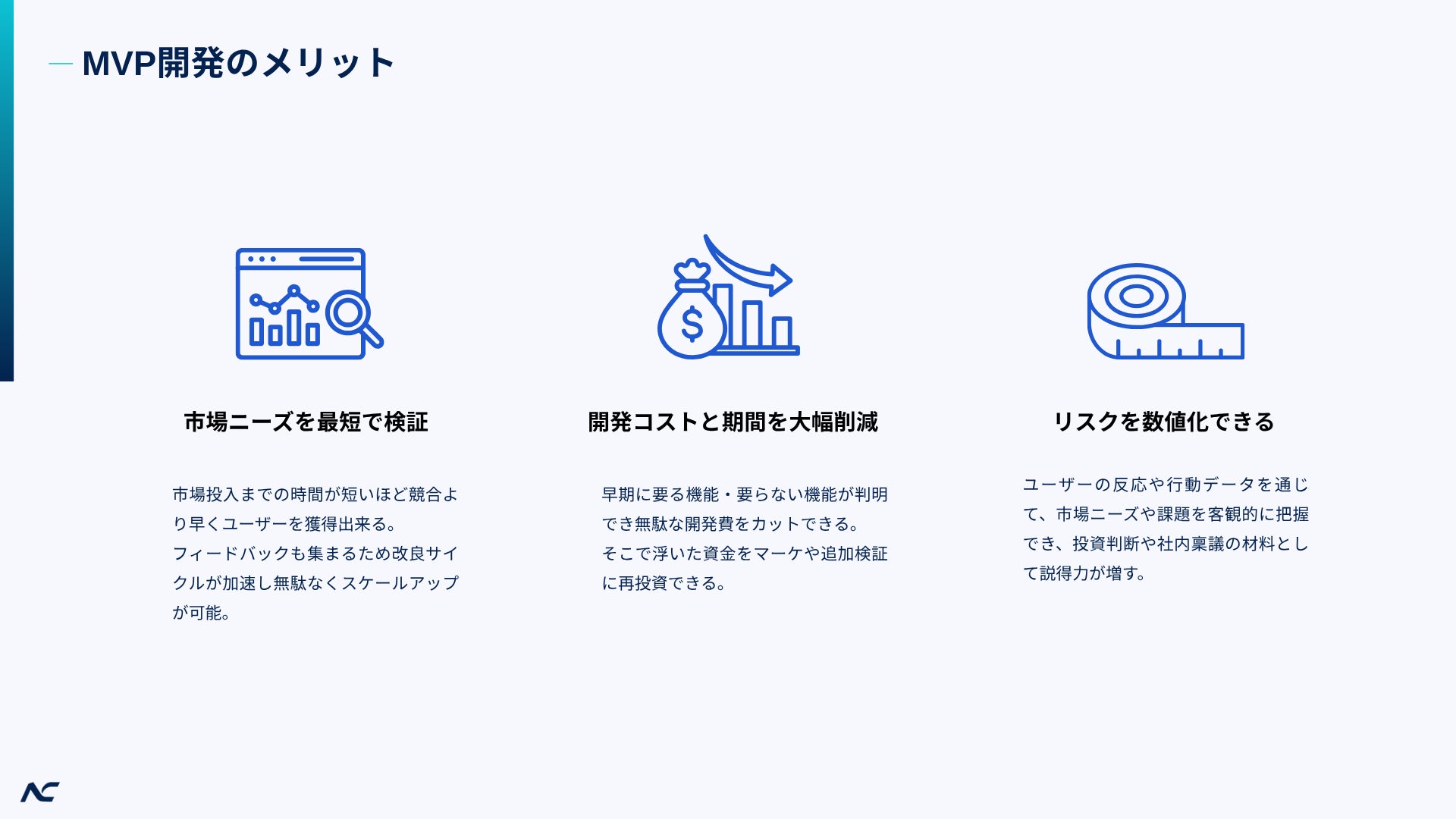 高速な仮説検証と機能改善を繰り返すことでPMF到達までの期間を短縮。初期投資を抑えた分、マーケティングや人材強化へ資金を再配分でき、収益化までのリスクを最小限に抑えられます。