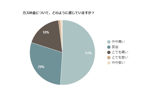 ガス料金について、「やや高い」が51%、「とても高い」が18%と合計69%の人が高いと回答しました。