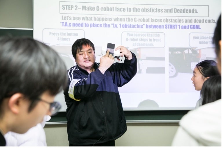 G-ROBOTは2輪ローバーを基礎としたプログラミング教材であり、様々なセンサーをとりつけプログラミングを行うことができます。今回は事前に「黒線にそって移動し、障害物や行き止まりにぶつかると、「静止」「サーボモーター(一定角度に回転するロボットモーター)の動作」を順番に行う」ようプログラムされており、参加者たちは異国のチームメイトたちと議論し、様々な配置の障害物や行き止まりを超えてスタートからゴールを目指すというミッションを課せられています。