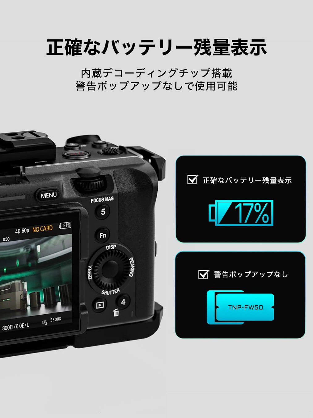 TILTANP-FW50互換カメラバッテリーは、高エネルギー密度のバッテリーセルを採用し、純正同等の大容量を実現。