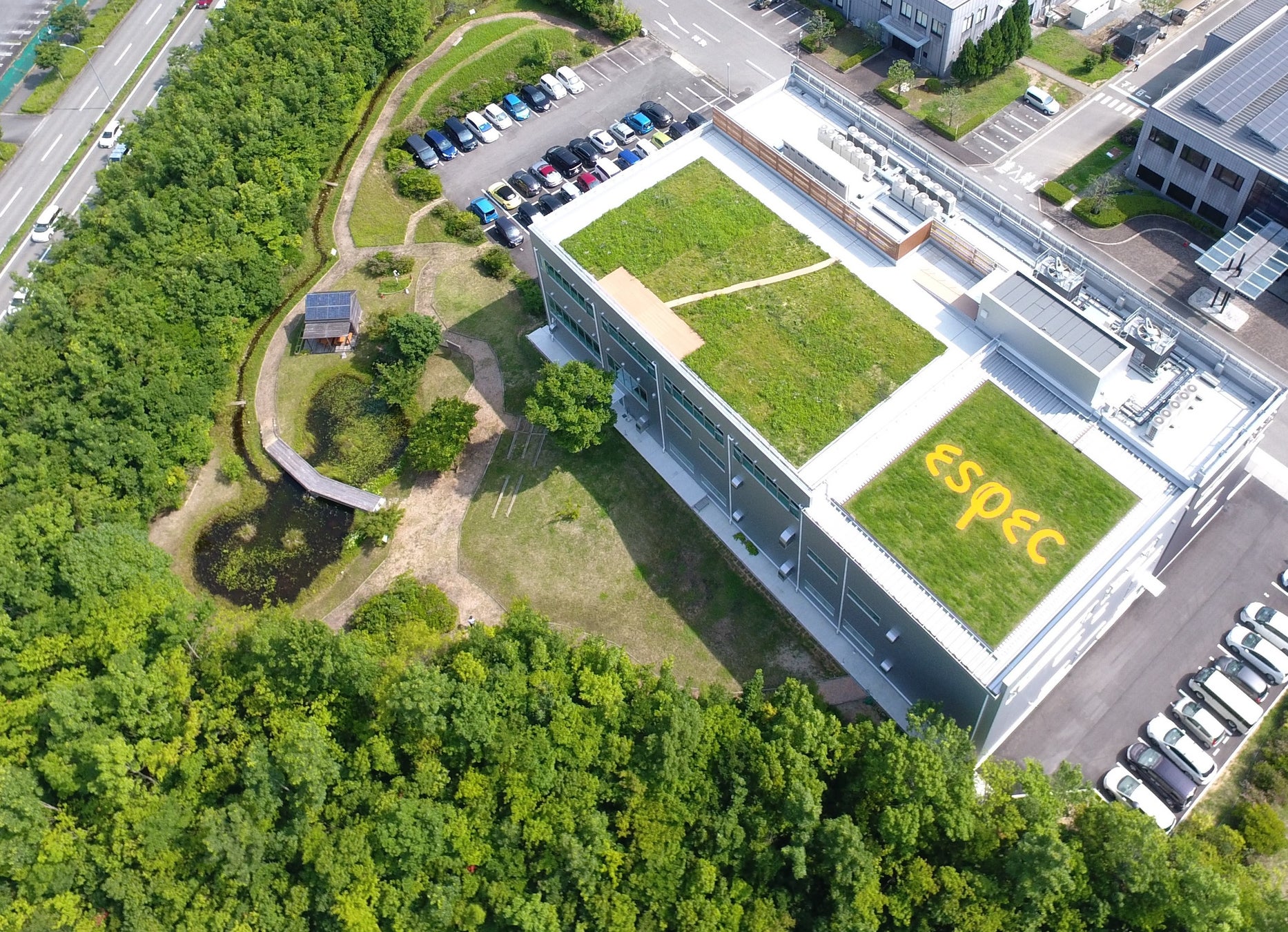 地域の植生調査をもとに選定した65種3万本の樹木を社員自らが植樹し、周囲の森林と連続性を持たせた「エスペックの森」を造成しています。また、地域性に配慮した草地と水辺からなるビオトープを整備し、多様な野鳥や昆虫が生息する生態系を創出しています。技術開発棟の屋上には、六甲北部のあぜ道を地域性種苗100%で再現した草地を造成し、希少種の生育環境にもなっています。さらに、敷地内の緑地整備に当たっては、自然循環や木材の活用を重視した維持管理を行っています。
