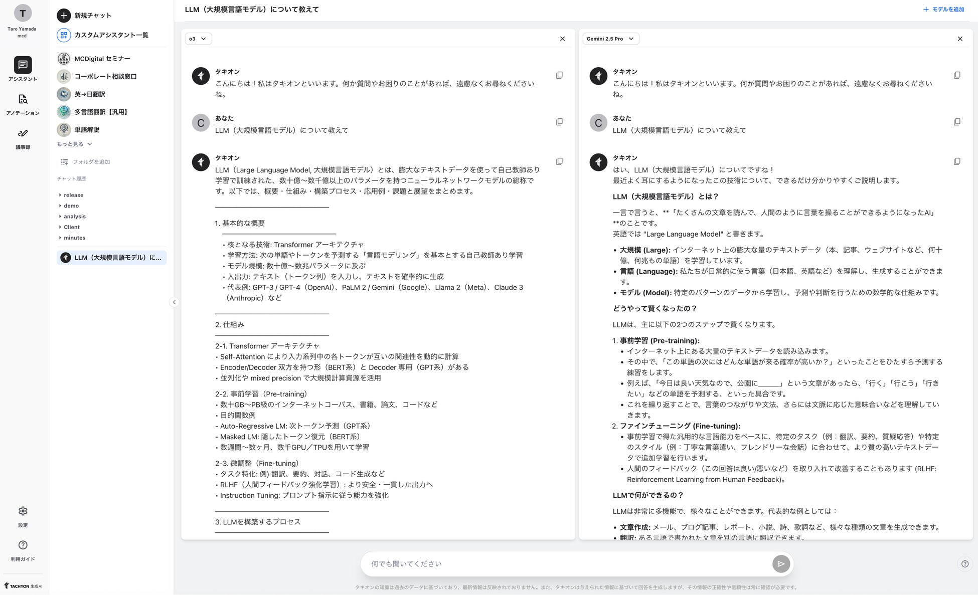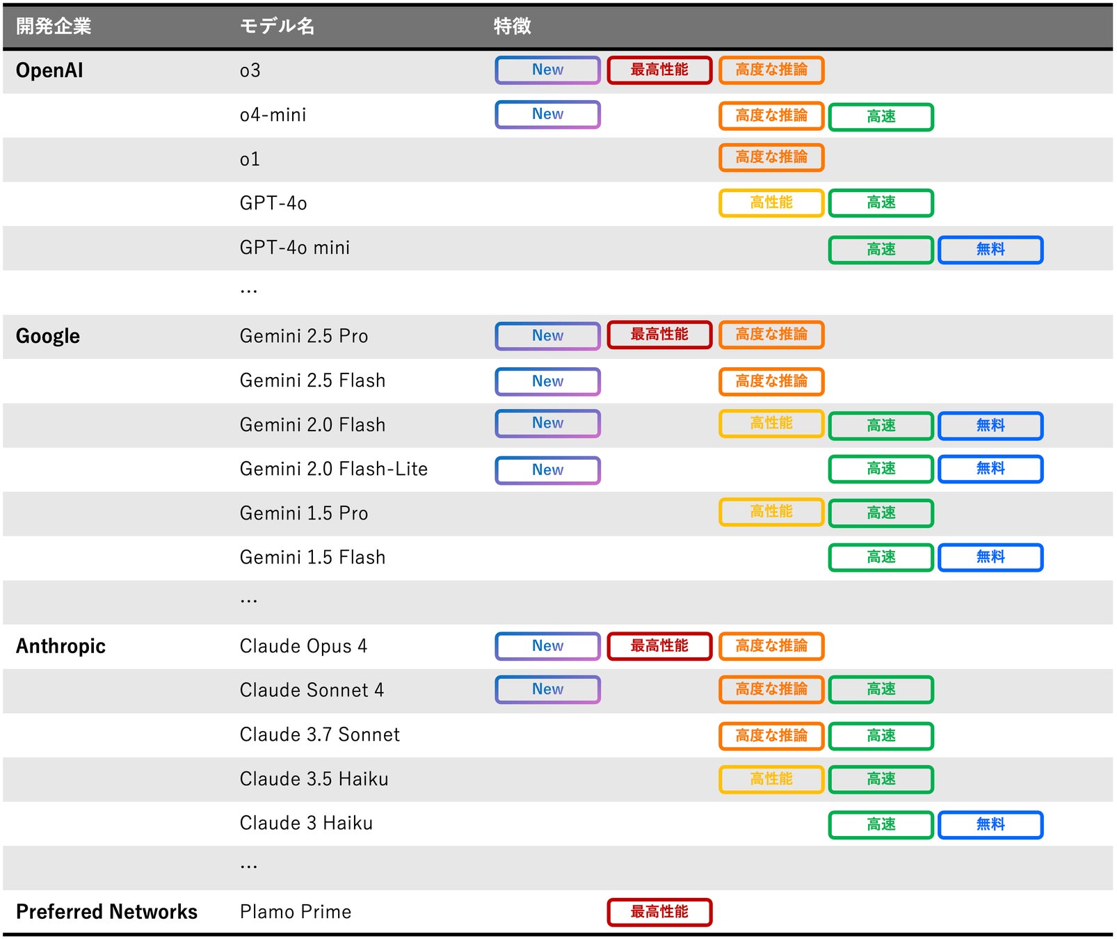例えば、極めて高度な専門知識や推論を伴う処理には「o3」「Gemini 2.5 Pro」「Claude Opus 4」、速度とコスト効率を両立した大量処理には「Gemini 2.5 Flash」、複雑なコーディング支援や柔軟な思考深度が求められるタスクには「Claude Sonnet 4」「o4-mini」 など、各種LLMの長所を活かした柔軟な活用が可能となります。本アップデートにより、ユーザー様のビジネスへの生成AI活用の幅がさらに広がることを期待しています。