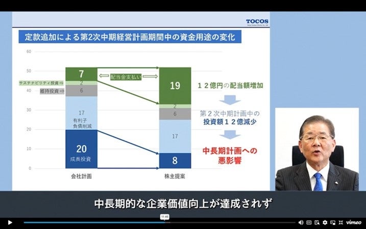 また、TOCOSは同じ動画の中で、株主提案である第6号議案との関係で、「当社は自動車製造業をはじめとする社会インフラとして重大な責務を負う各種産業の一端を担っております。高品質な製品を安定的に供給するべく国内外に複数の製造・販売拠点を有しております。これらの拠点において自然災害等による操業停止等不測の事態が発生した場合には復旧作業又は代替となる拠点の確保・供給方法の手配等のため当社にて莫大な資金を機動的に確保・運用する必要が生じます。また、機動的かつ十分な資金確保の観点からこれを金融機関からの融資に依存する体制にはリスクがあります。」と主張しています。