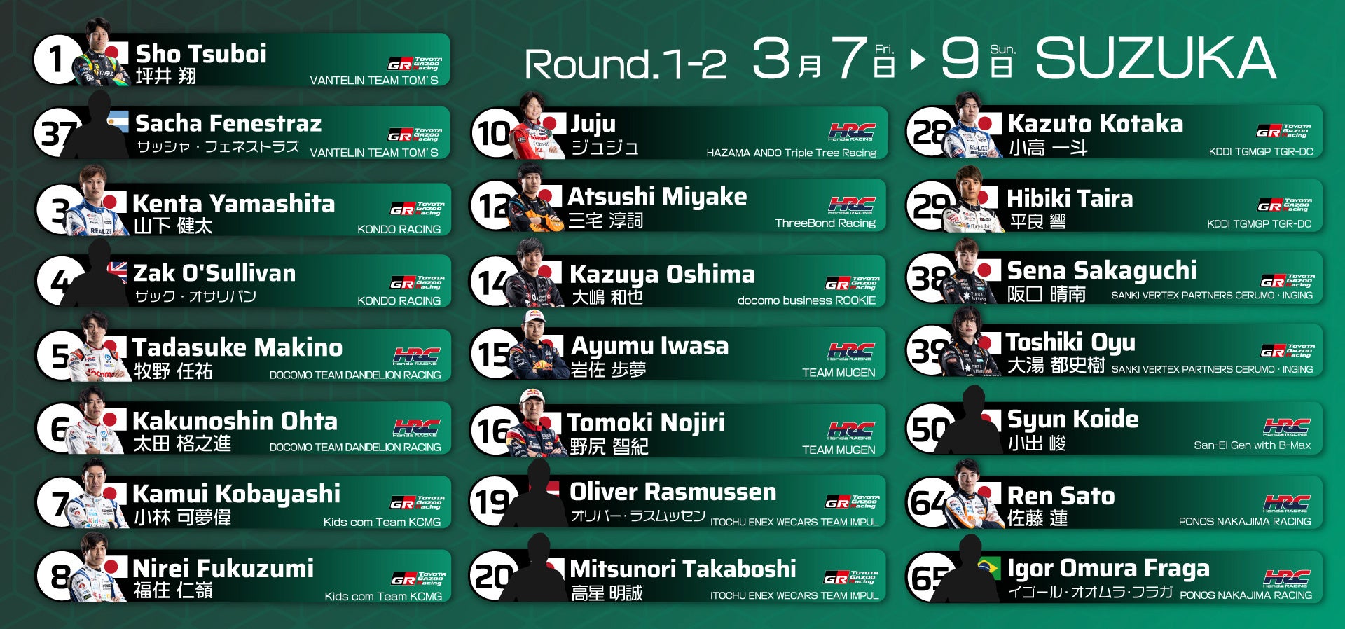 2025年シーズンは2⽉18⽇(⽕) – 19⽇(⽔)、開幕前に唯⼀、全チーム・全ドライバーが参加する公式テストを経て、3⽉7⽇(⾦) – 9⽇(⽇)に、鈴⿅サーキットにて開幕いたします。