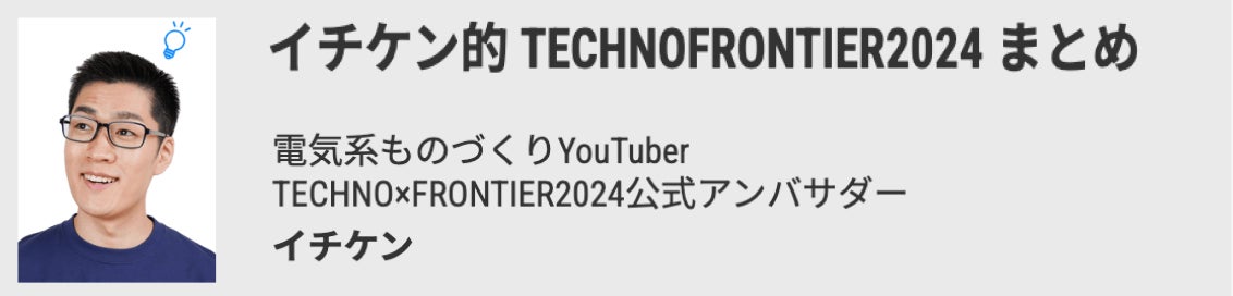 今回は、主催者講演より、電気系ものづくりYouTuber TECHNO×FRONTIER2024公式アンバサダー イチケン氏が語る「イチケン的 TECHNOFRONTIER2024 まとめ」をご紹介いたします。