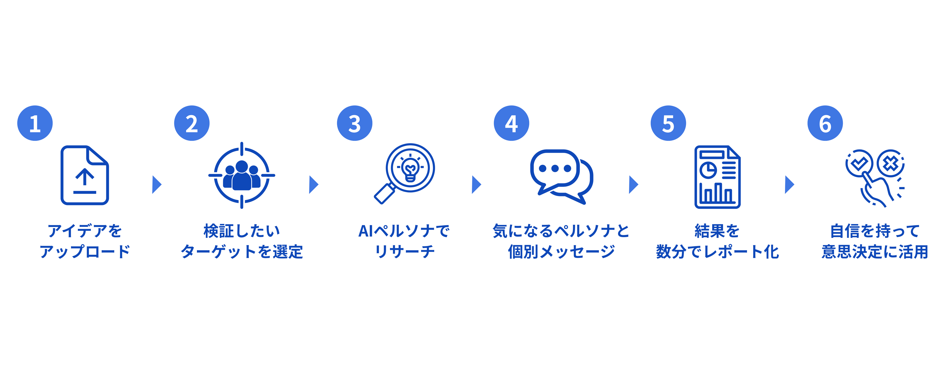 独自の現実反映型モデリング機能を駆使して、実際の市場とそこに暮らす人々を、高精度で再現します。性別、年齢、職業、役職、収入などから、ターゲットとなるセグメントを自由に設定し、広告クリエイティブや新規事業アイデアに対する評価・コメントを収集することで、効果的な市場分析を実現します。