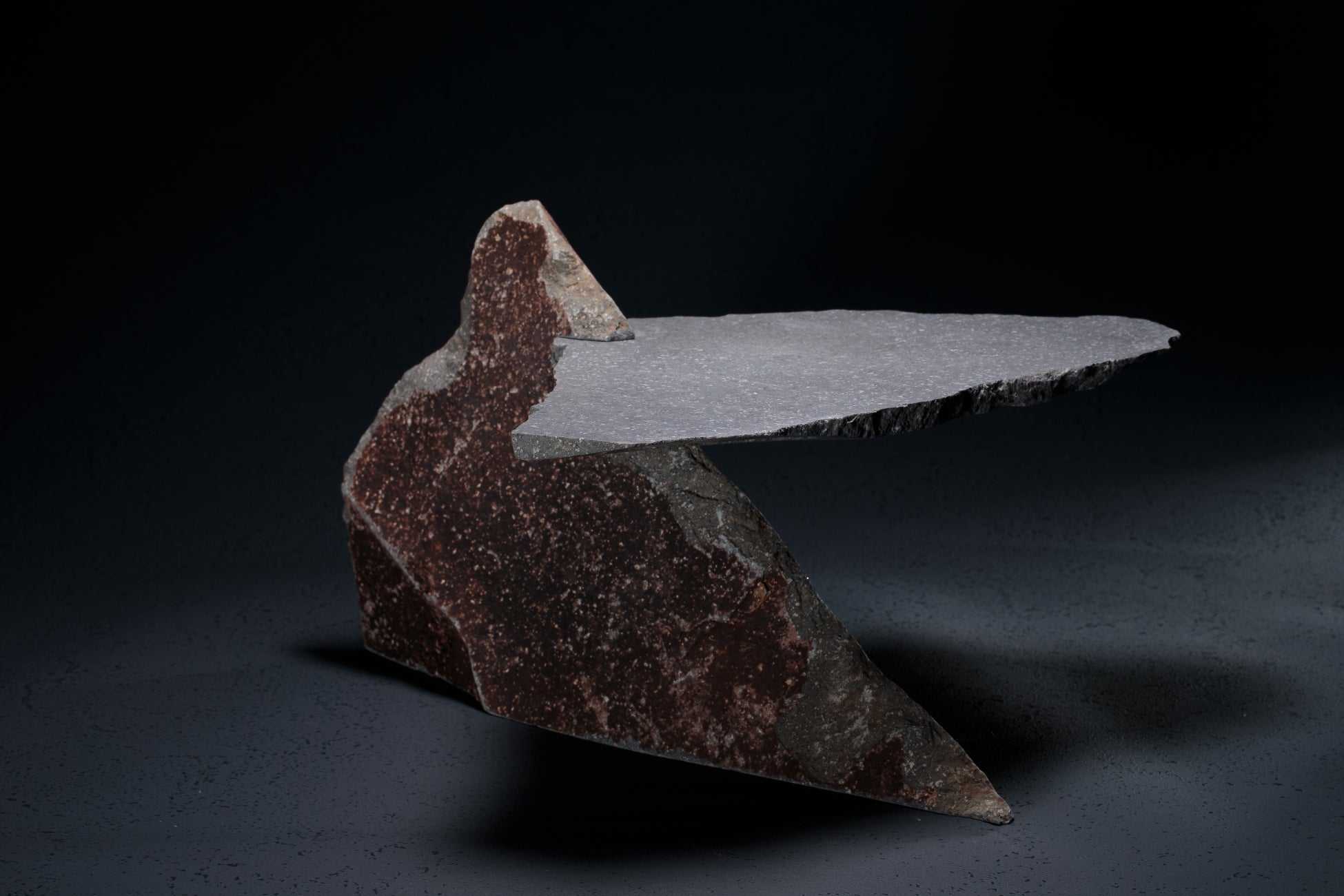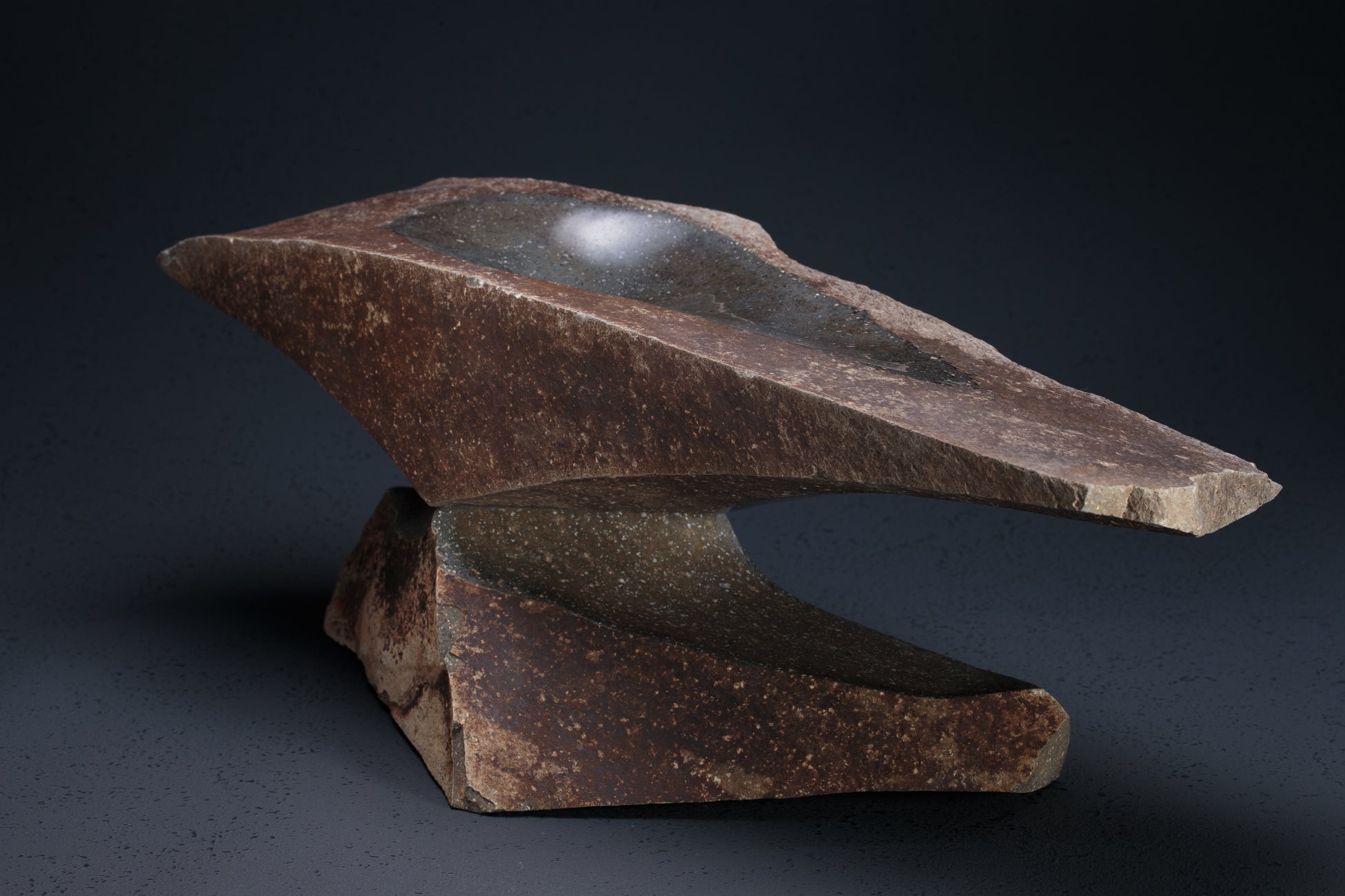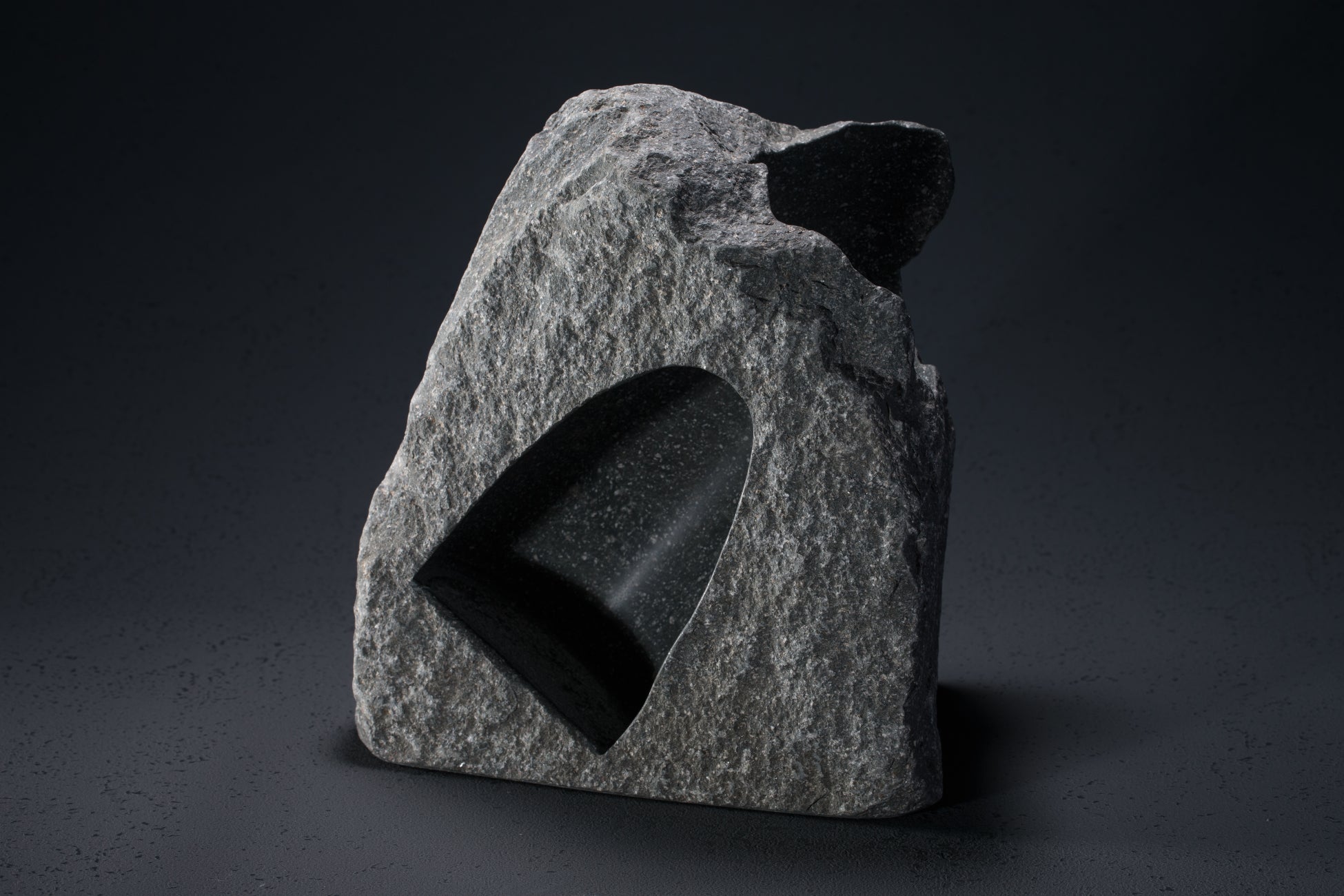 石匠と漆芸作家・武藤久由氏によるコラボレーション作品。40万年の時を経た石の力強さと、漆の艶やかな光沢が響き合い、素材の対話を通じた新しい美を提示します。