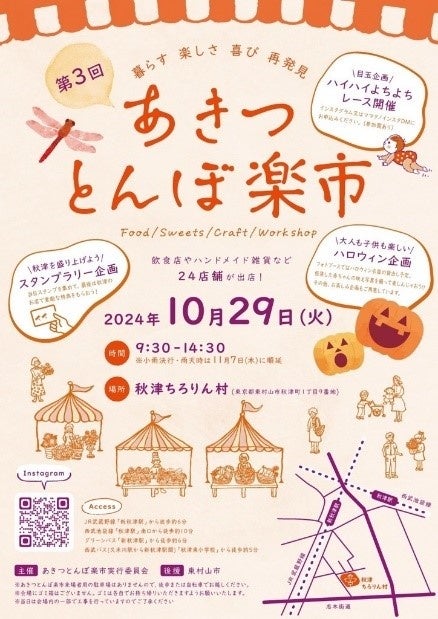 暮らす楽しさや喜びを再発見することをコンセプトに、秋津ちろりん村(所在地:東京都東村山市秋津町1-9)にて「第3回あきつとんぼ楽市」を開催します!