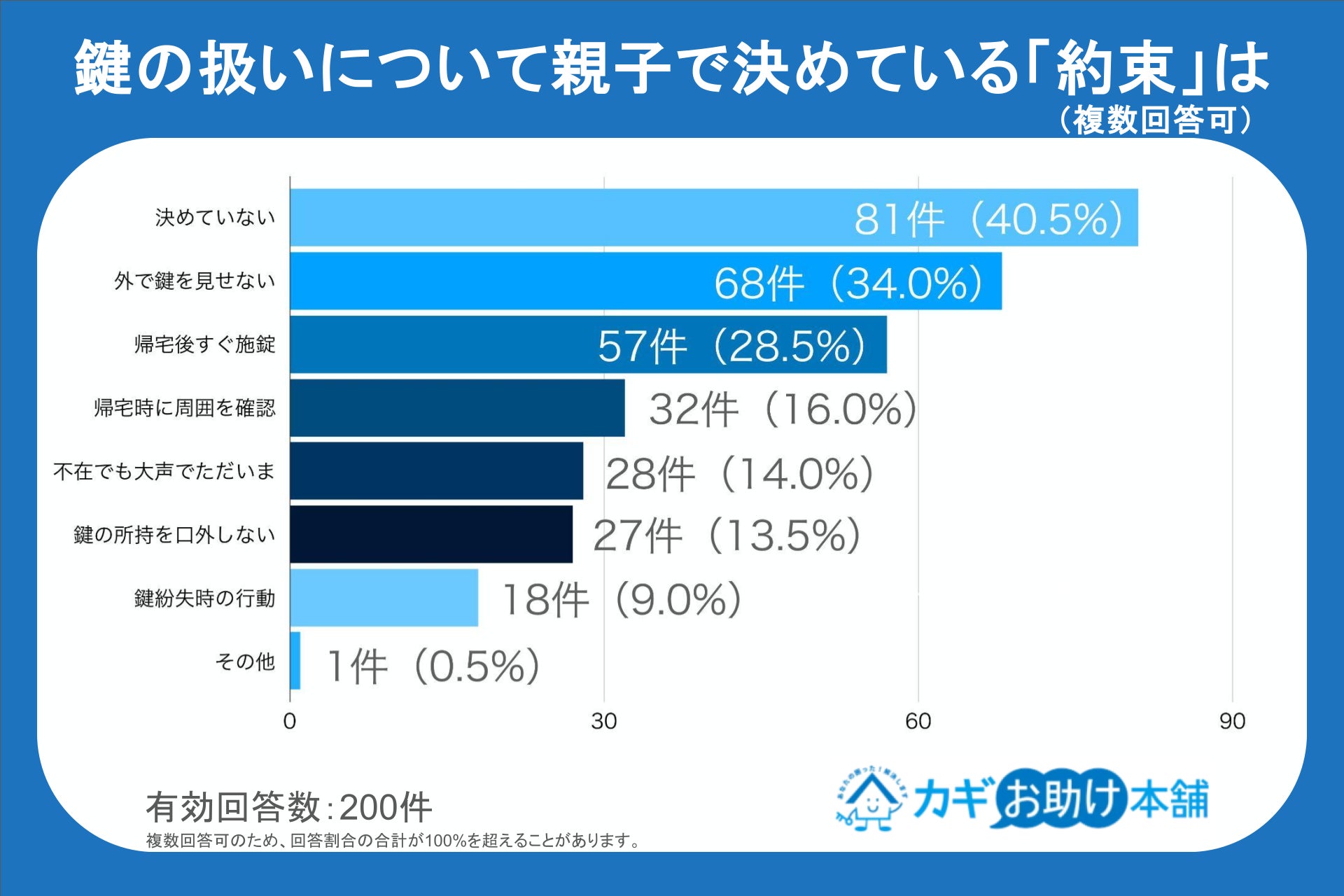 一方で、約束を決めている家庭の内容を見ると、1位は「外で鍵を見せない(34.0%)」、2位は「帰宅後すぐに鍵を閉める(28.5%)」でした。