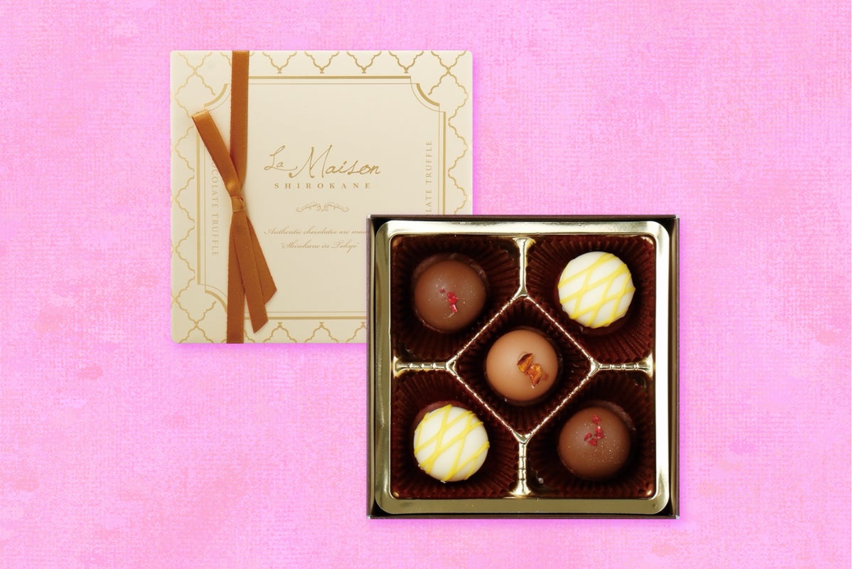 東京・白金の洋菓子店「ラ・メゾン白金」が贈るUne bouchée de bonheur(一口の幸せ)をテーマにした華やかで繊細な3種のトリュフ。