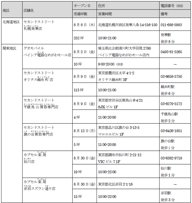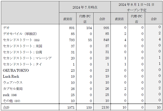 新たに「セカンドストリート」6店舗(国内4店舗、海外2店舗)、「ゲオモバイル」2店舗、「カプセル楽局」2店舗の、合計10店が2024年度8月度に新たにオープンします。