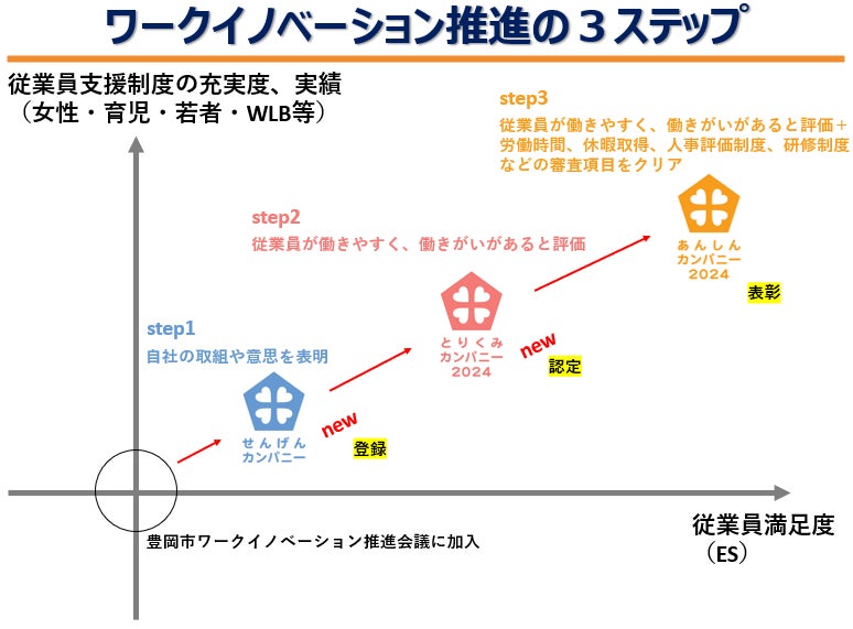 2024年度、豊岡市では、あんしんカンパニー受賞を目指してステップアップしていく制度に変更しました。とりくみカンパニーは、あんしんカンパニーの一次審査をクリアし、従業員が働きやすく、働きがいがあると高く評価した事業所です。
