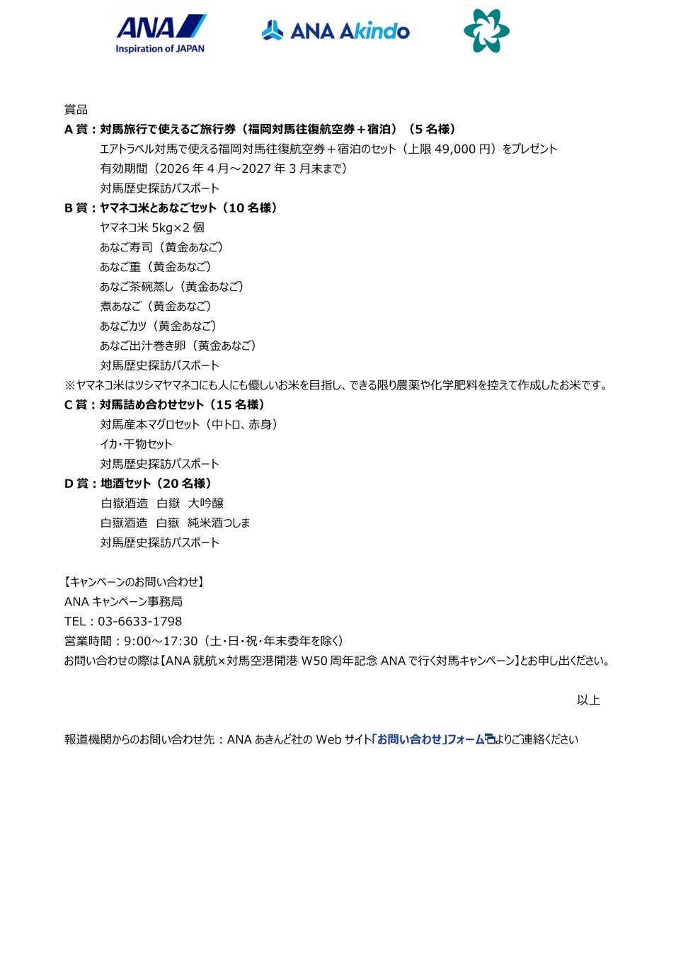 全日本空輸株式会社長崎支店、ANAあきんど株式会社長崎支店(所在地:長崎市、支店長:神谷 賢宏、以下「ANA長崎支店」)、対馬市(所在地:対馬市、市長:比田勝 尚喜)は、ANA対馬-福岡路線就航と対馬空港開港それぞれの50周年を記念し、対馬への搭乗販促キャンペーンを実施致します。