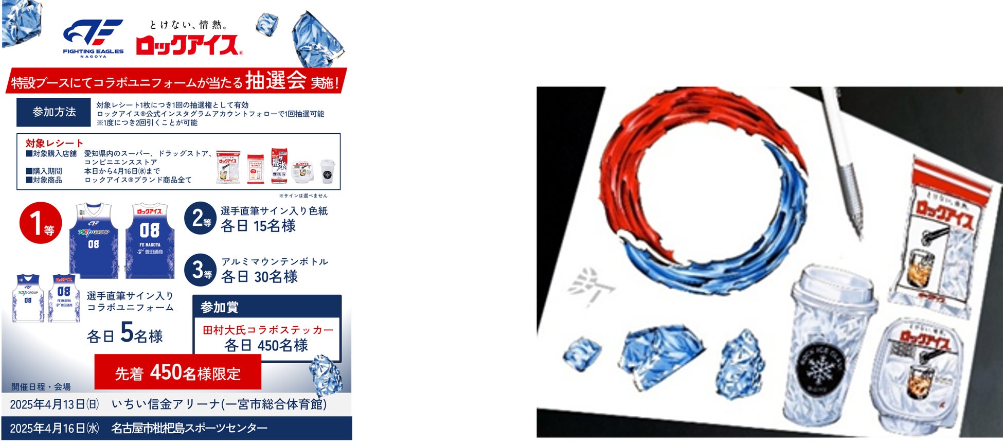 小久保製氷冷蔵株式会社(KOKUBOグループ、本社:千葉県八千代市、代表取締役社長:小久保 龍平、以下小久保製氷冷蔵)は、4月13日(日)にいちい信金アリーナ(一宮市総合体育館)で開催される、りそなグループ B.LEAGUE 2024-25 SEASON 第31節 GAME2「ファイティングイーグルス名古屋VS茨城ロボッツ」、4月16日(水)に名古屋市枇杷島スポーツセンターで開催される、りそなグループ B.LEAGUE 2024-25 SEASON 第32節「ファイティングイーグルス名古屋VS三遠ネオフェニックス」に冠協賛します。当日は「ロックアイスⓇ」商品をご購入いただいたレシートのご提示等で、選手直筆サイン入りグッズや世界的イラストレーター「田村大」氏と「ロックアイス」のコラボステッカーが当たる抽選会を実施します。