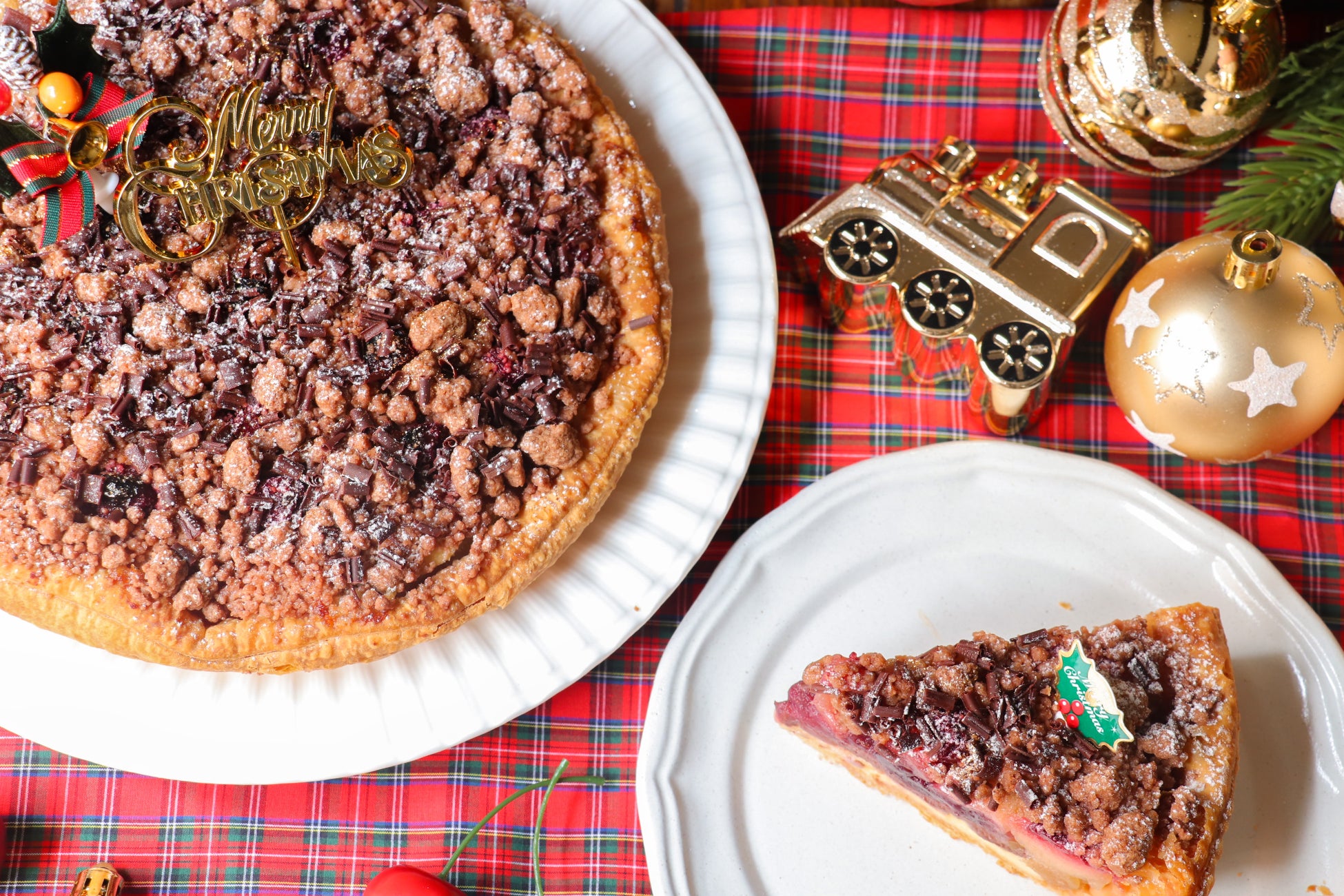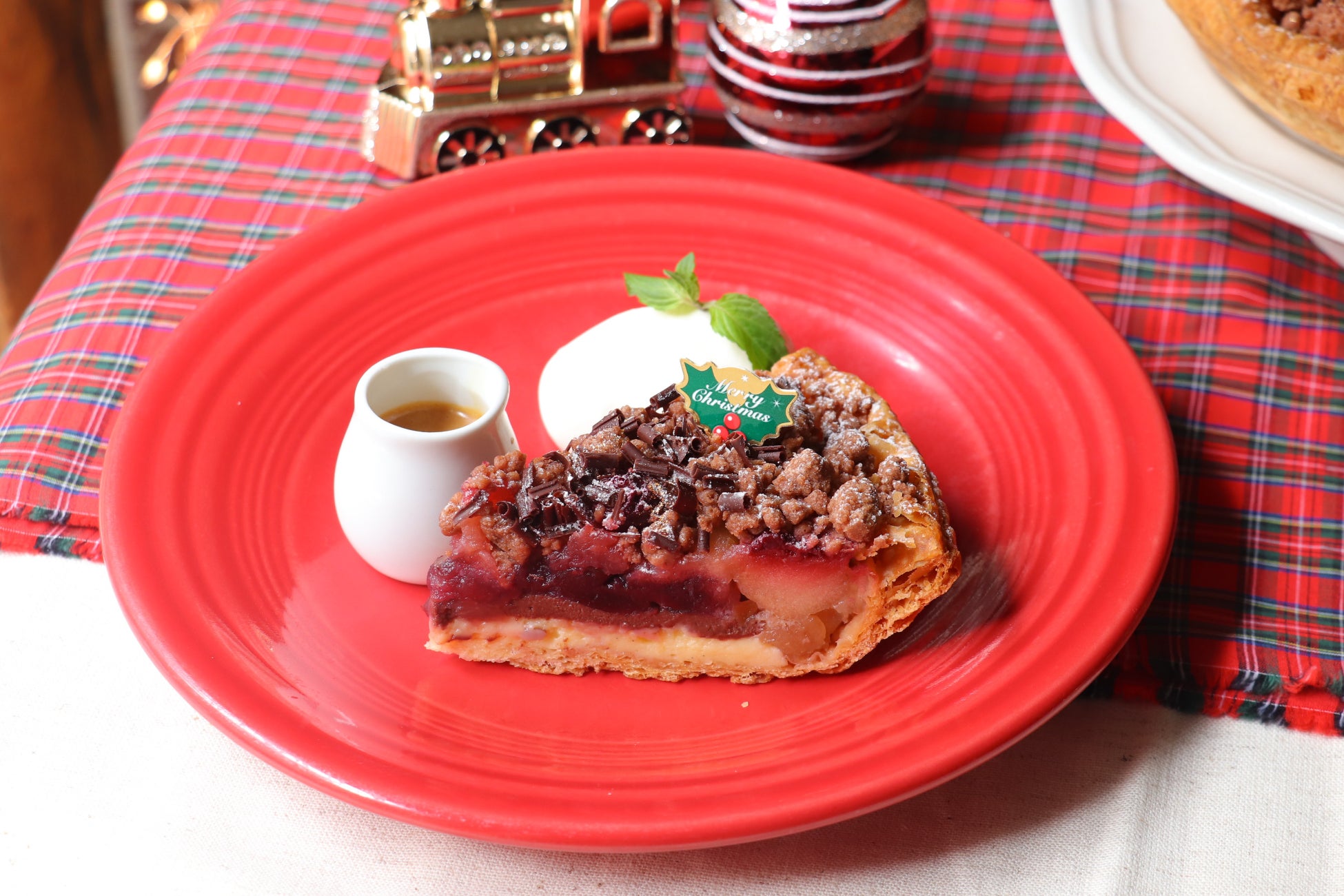 自家製カスタードクリームにビターチョコレートを重ね、芳醇なキルシュが香るチェリーフィリングと青森県産りんごを合わせて焼き上げた、今年のクリスマス限定アップルパイ。