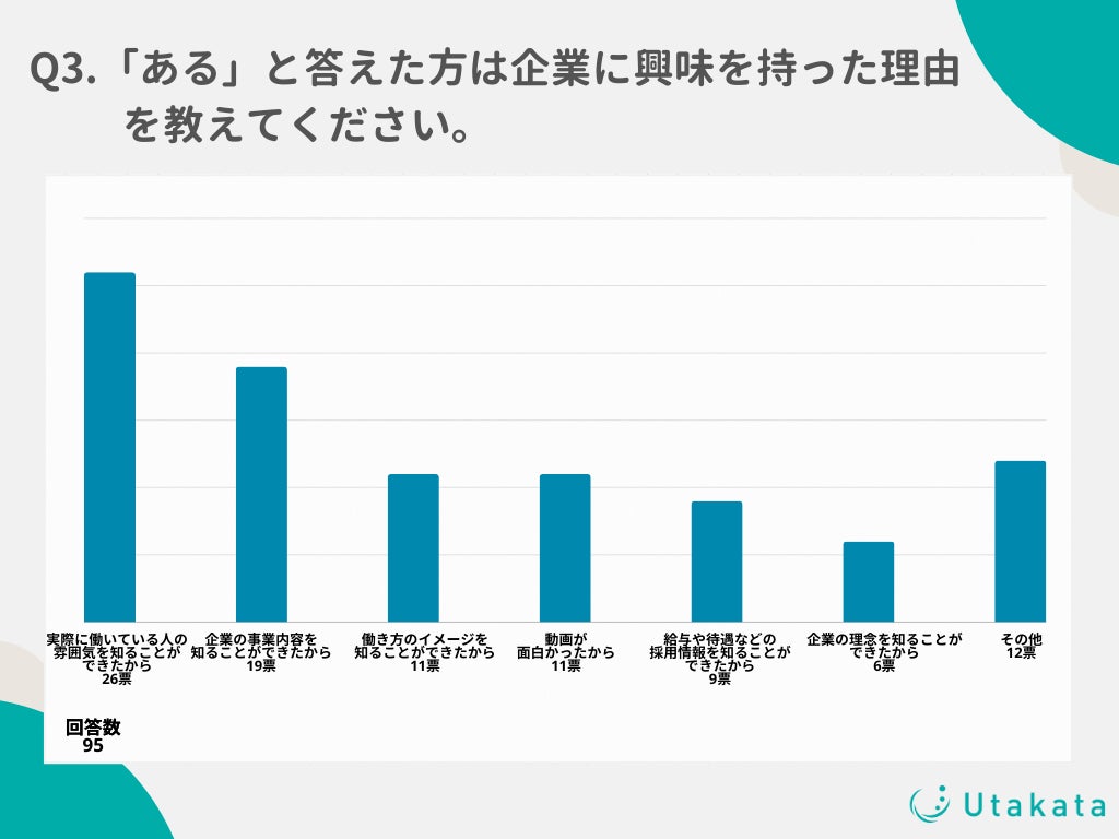 「『動画きっかけで企業に興味を持ったことがある』と答えた方は企業に興味を持った理由を教えてください。」と質問したところ、「実際に働いている人の雰囲気を知ることができたから」が26票、「企業の事業内容を知ることができたから」が19票、「働き方のイメージを知ることができたから」「動画が面白かったから」が11票、「給与や待遇などの採用情報を知ることができたから」が9票という回答となりました。