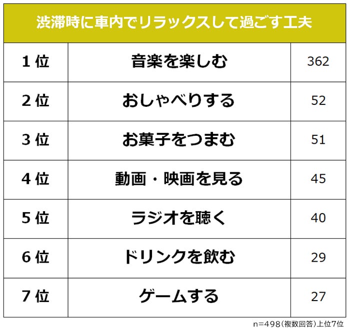 【渋滞時の車内でリラックスして過ごすための工夫ランキング】社会人498人アンケート調査