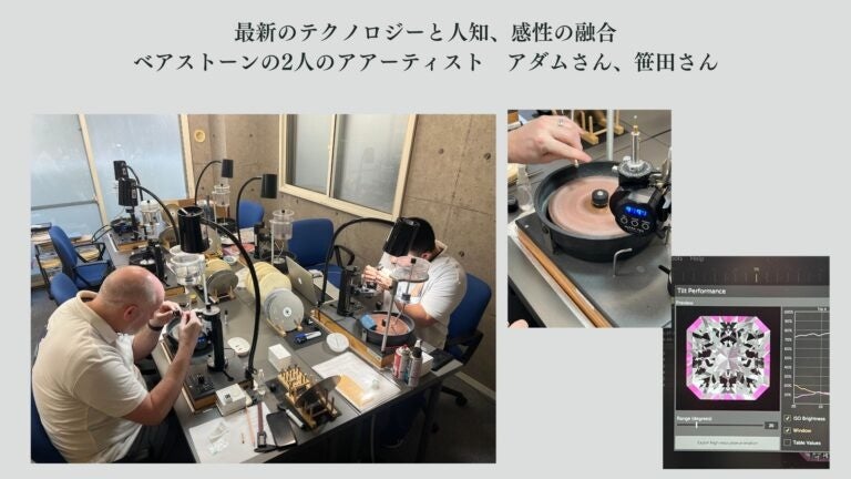 <最良のオレゴンサンストーン原石>を自ら採掘し、アメリカ ツーソンを始めとする世界各国から上質な原石を買い付け、世界で最も精密度の高い宝石研磨機、最新のテクノロジーである Ultra-Tec V5や Ultra-Tec VL (米国製)を使い、最適な幾何学をもって制作に取り掛かるベアストーンのアーティストアダムさん、笹田さん。