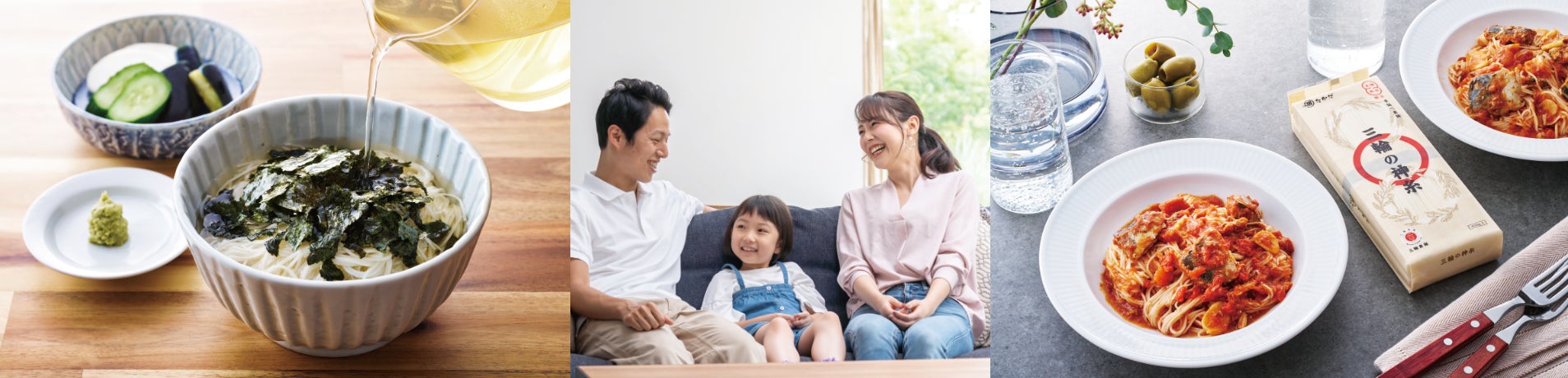 主力製品『三輪の神糸』がある食卓、四季を通して素麺を楽しめる専門店「てのべたかだや」、ローリングストック啓蒙を推進する「パントリーのお守りPROJECT」、外国人採用や障害者施設との取り組みなど、明日の素麺の在り方を通じて私たちは日本の食文化に誰もが携わる場所づくりに挑み続けます。