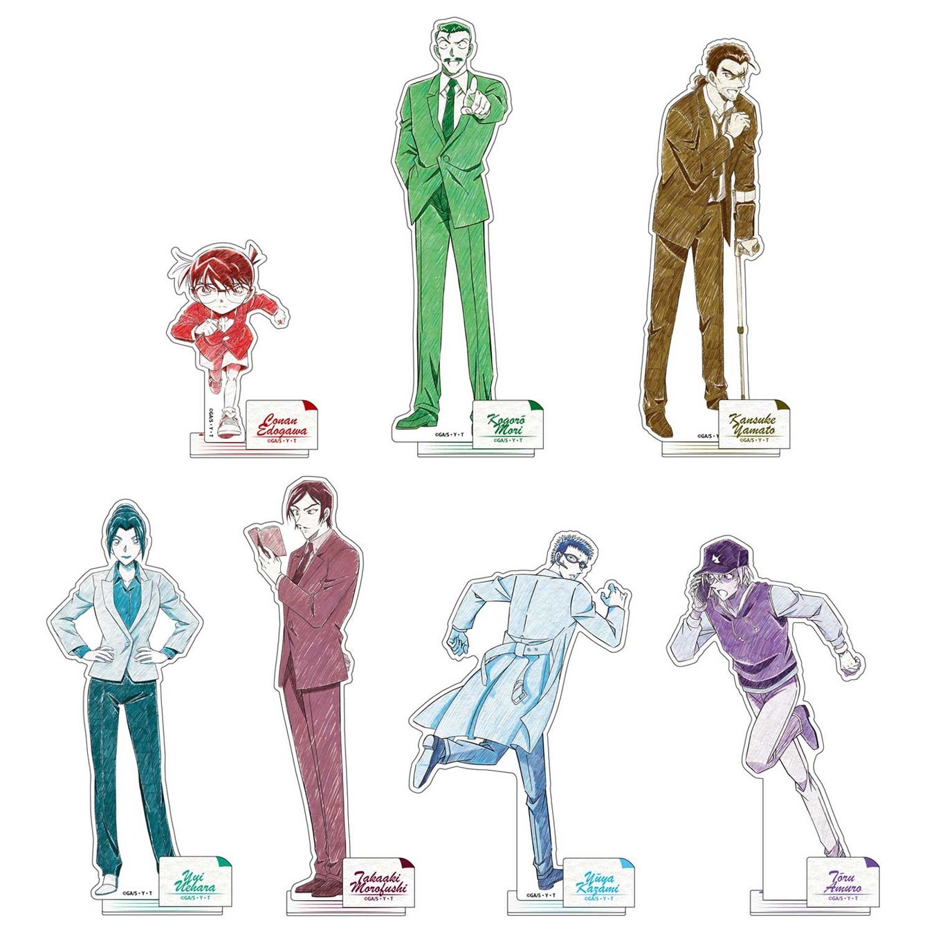 水彩鉛筆の繊細なタッチが美しい『ペンシルアート』を使用したアクリルスタンドはキャラクターが際立つデザインとなっており、プレートのまま飾っても、組み立て飾っても存在感のある商品です。ラインナップは、江戸川コナン・毛利小五郎・大和敢助・上原由衣・諸伏高明・風見裕也・安室透の全7種。