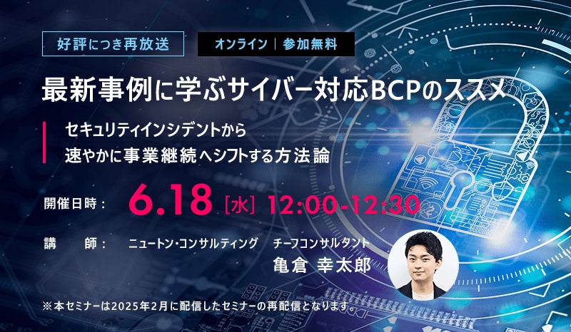 リスクマネジメントコンサルティングを手掛けるニュートン・コンサルティング株式会社(本社:東京都千代田区、代表取締役社長:副島 一也)は、6月18日(水)12:00~12:30に無料ウェビナー「最新事例に学ぶサイバー対応BCPのススメ~セキュリティインシデントから速やかに事業継続へシフトする方法論~」を開催いたします。なお、本セミナーは 2025年2月に開催したセミナーの再配信となります。