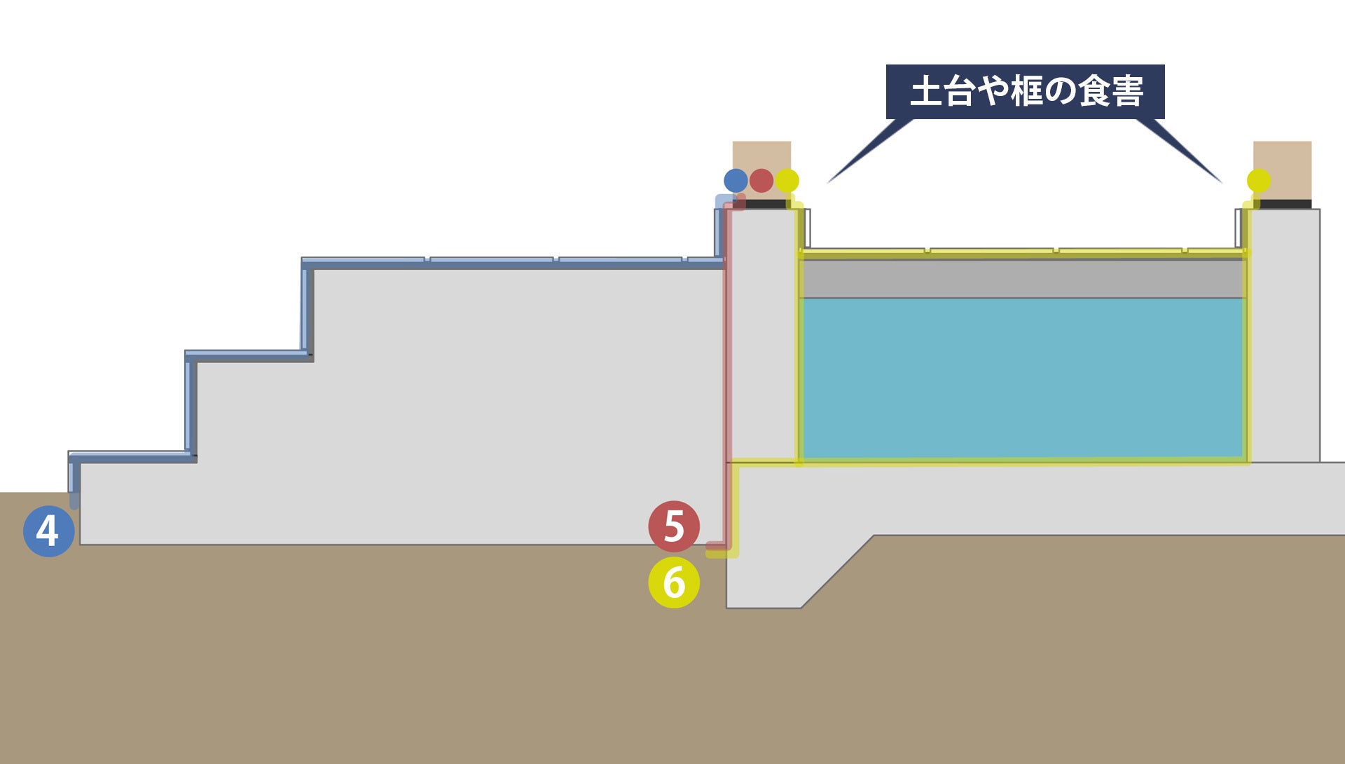 しかし、基礎外周の打ち継ぎ部の防蟻効果が高まる一方で、玄関ポーチと基礎の立ち上がりとの間には打ち継ぎ部が存在するため、シロアリの侵入経路⑤が残ります。