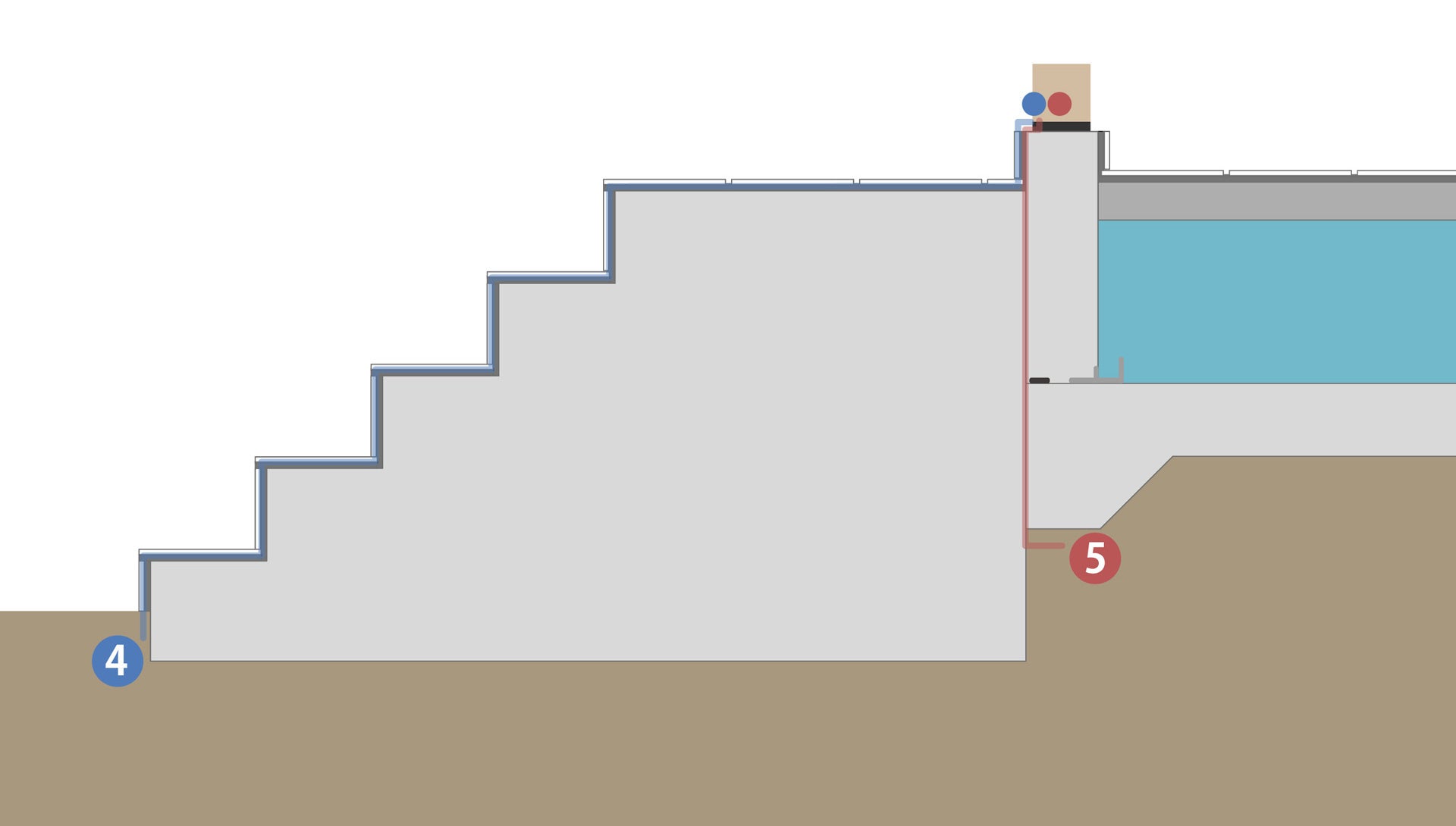 ベース部を階段の中間部に設けるなど、敷地条件に応じてベース部天板の露出を確保します。S3工法と同様、ベース部天板(水色斜線部)にはタイルなどの張り付けを行いません。