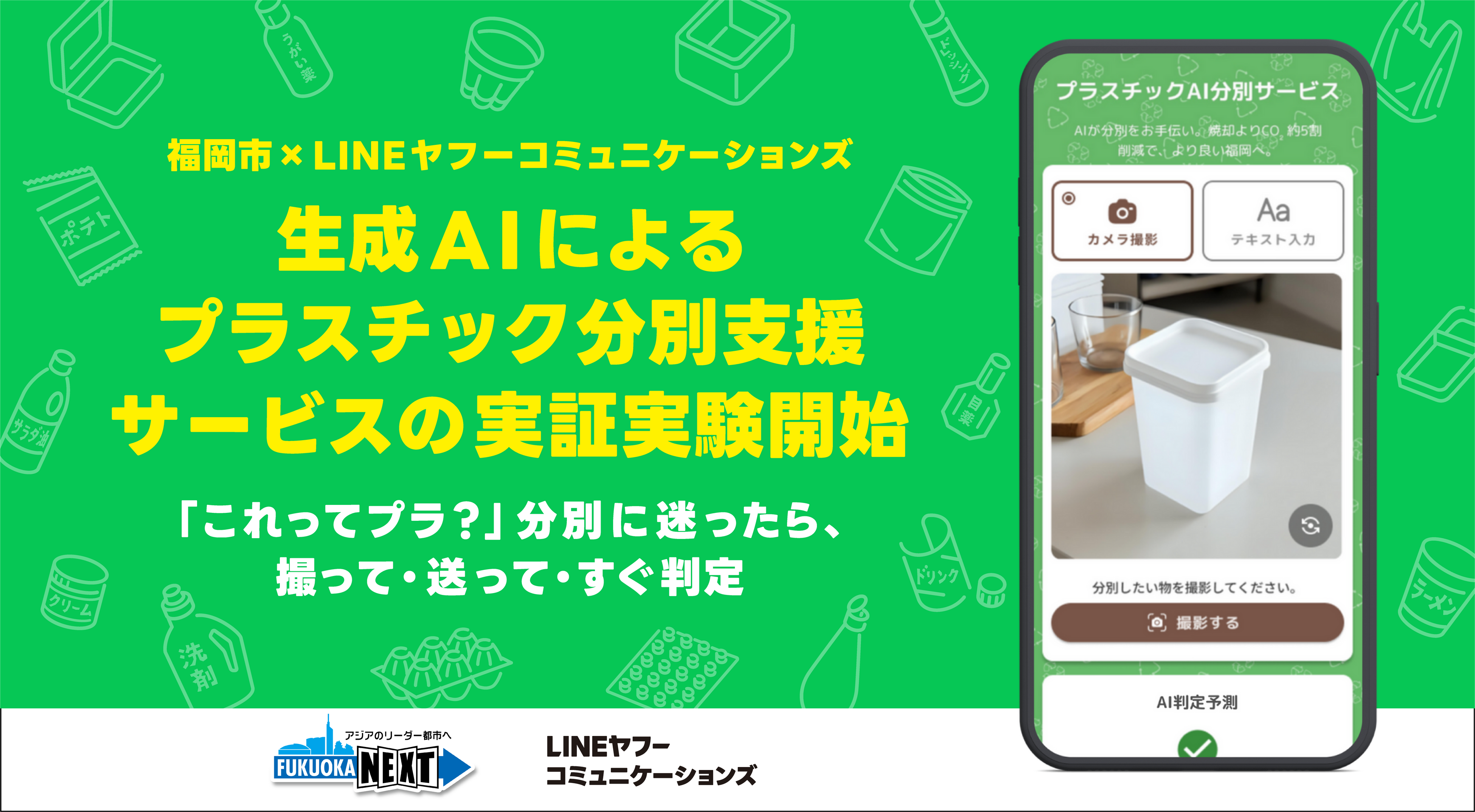 LINEヤフーコミュニケーションズ株式会社(本社:福岡市博多区、以下 当社)は、福岡市との公民共働事業として、同市で2027年2月より開始予定のプラスチック分別収集に先立ち、福岡市LINE公式アカウント上で利用できる生成AIによるプラスチック分別支援サービスのβ版を開発し、2025年10月25日から実証実験を開始します。分別したい物を撮影または名称入力すると、プラスチック分別ができるか・できないかのAI判定予測を即時提示するサービスです。